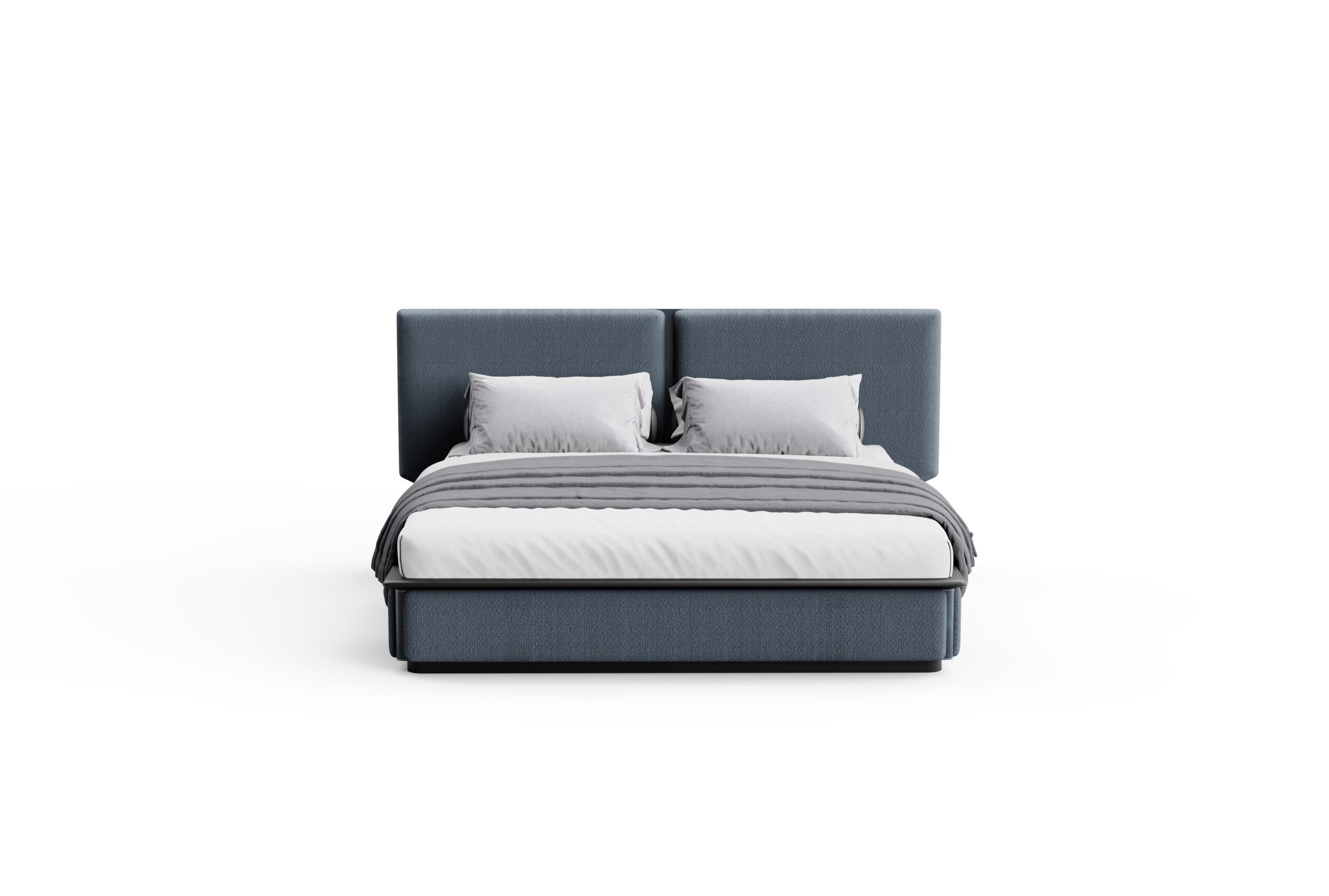 The headboard features a thoughtful composition – upholstery divided into two sections, subtly revealing a leather-wrapped layer beneath as a distinctive design detail. Extending beyond the base frame, the headboard is defined by angular contours softened with rounded corners, adding both structure and elegance.Echoing the headboard’s aesthetic, the base frame is accented with exposed leather at the corners, creating a refined termination detail. A rounded wooden molding at the top edge neatly frames the mattress, lending a polished, tailored finish.