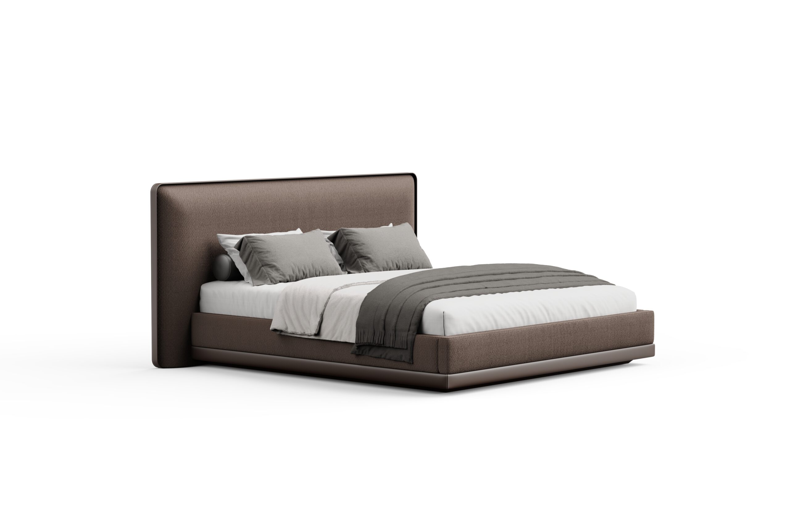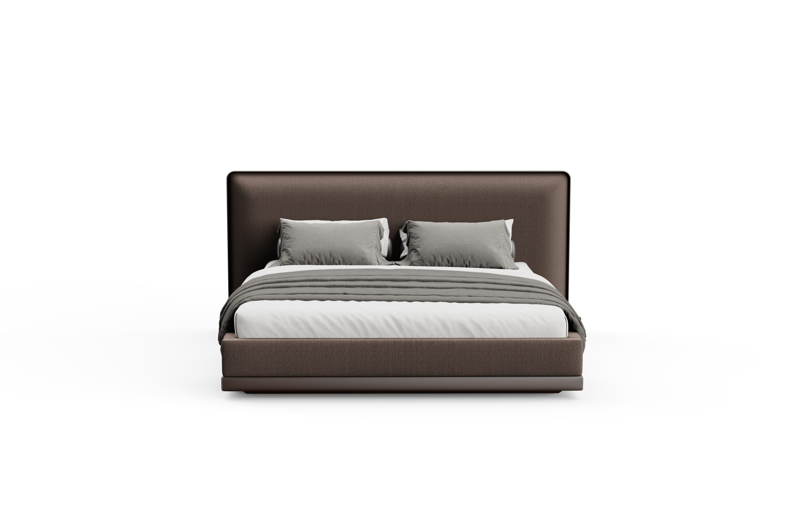 The understated base comprises clean, rectangular upholstered panels resting atop a leather-wrapped platform, allowing the headboard to remain the focal point. A veneer-finished skirting grounds the composition, adding a subtle touch of material contrast. Thoughtfully composed, Aven balances structure and softness, making it a sophisticated statement in any bedroom.