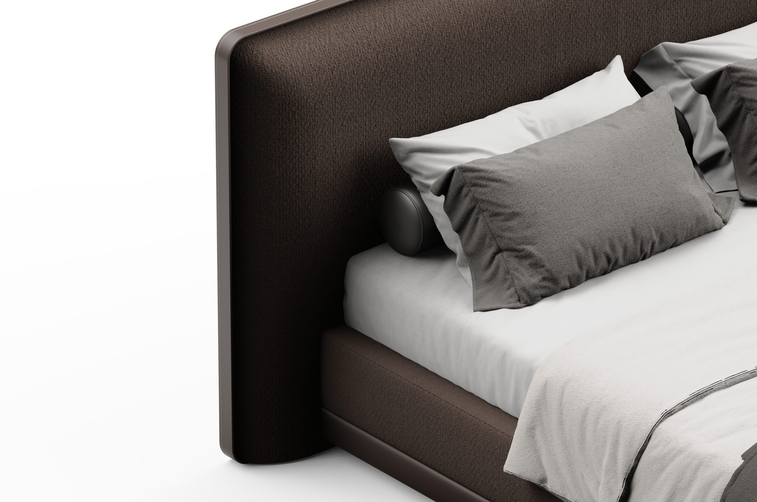 Aven Bed is defined by its quiet elegance, where refined details bring depth and distinction to a simple form. The extended headboard features a gently curved upholstered surface that tapers gracefully along the edges, offering a soft, sculptural presence. Framed by a sleek leather loop, the headboard casts delicate shadows that enhance its dimensionality and visual warmth.