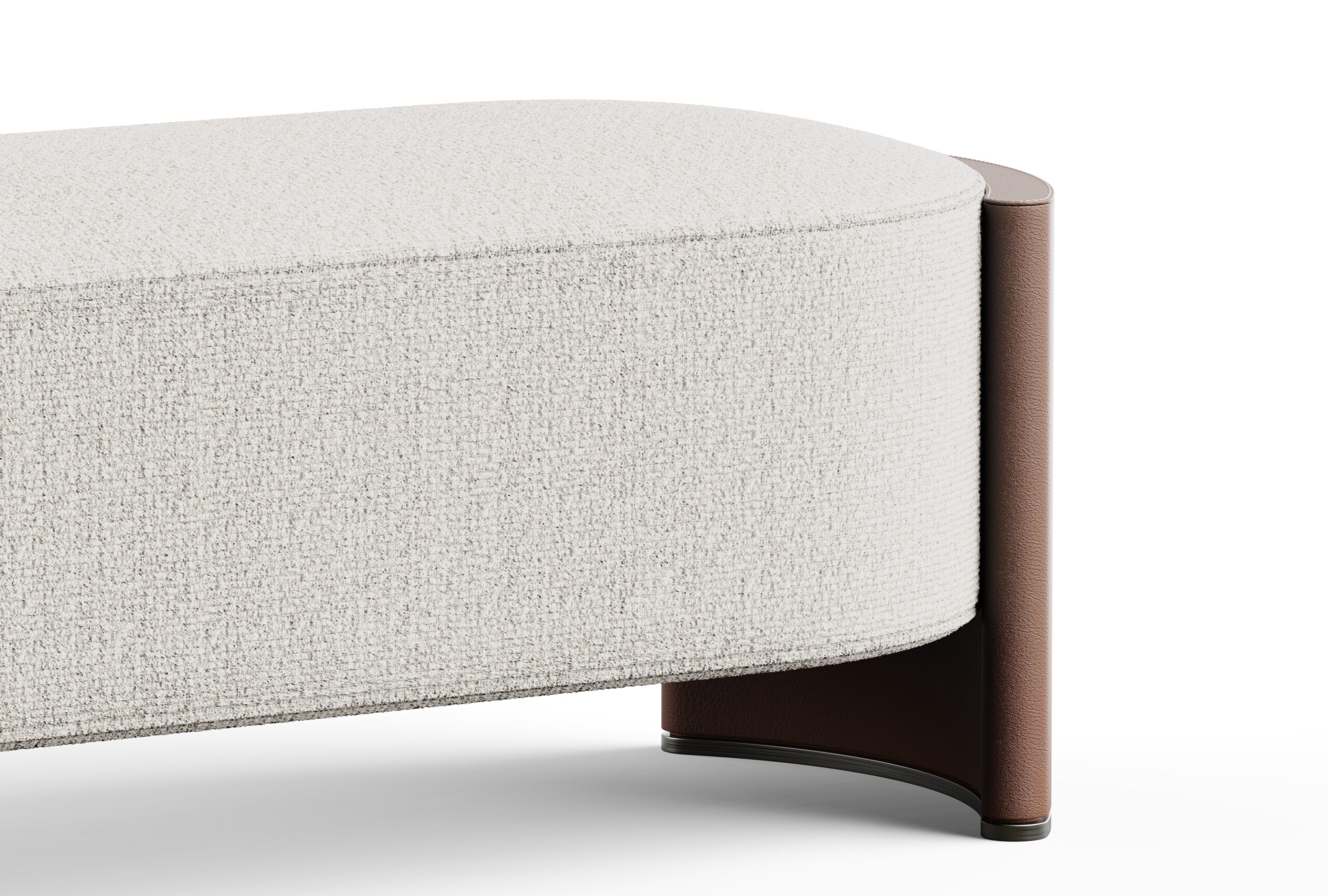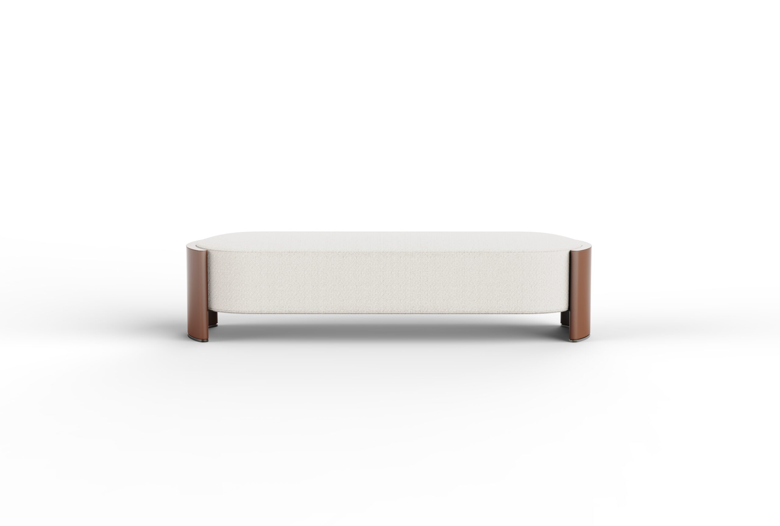 The vintage sheen of the leather contrasts with the rich texture of the fabric, creating a sophisticated interplay of materials. An open space beneath the seat adds visual lightness, balancing the bench’s substantial form. Elegantly proportioned and thoughtfully detailed, Brisa is a quiet statement of modern sophistication.