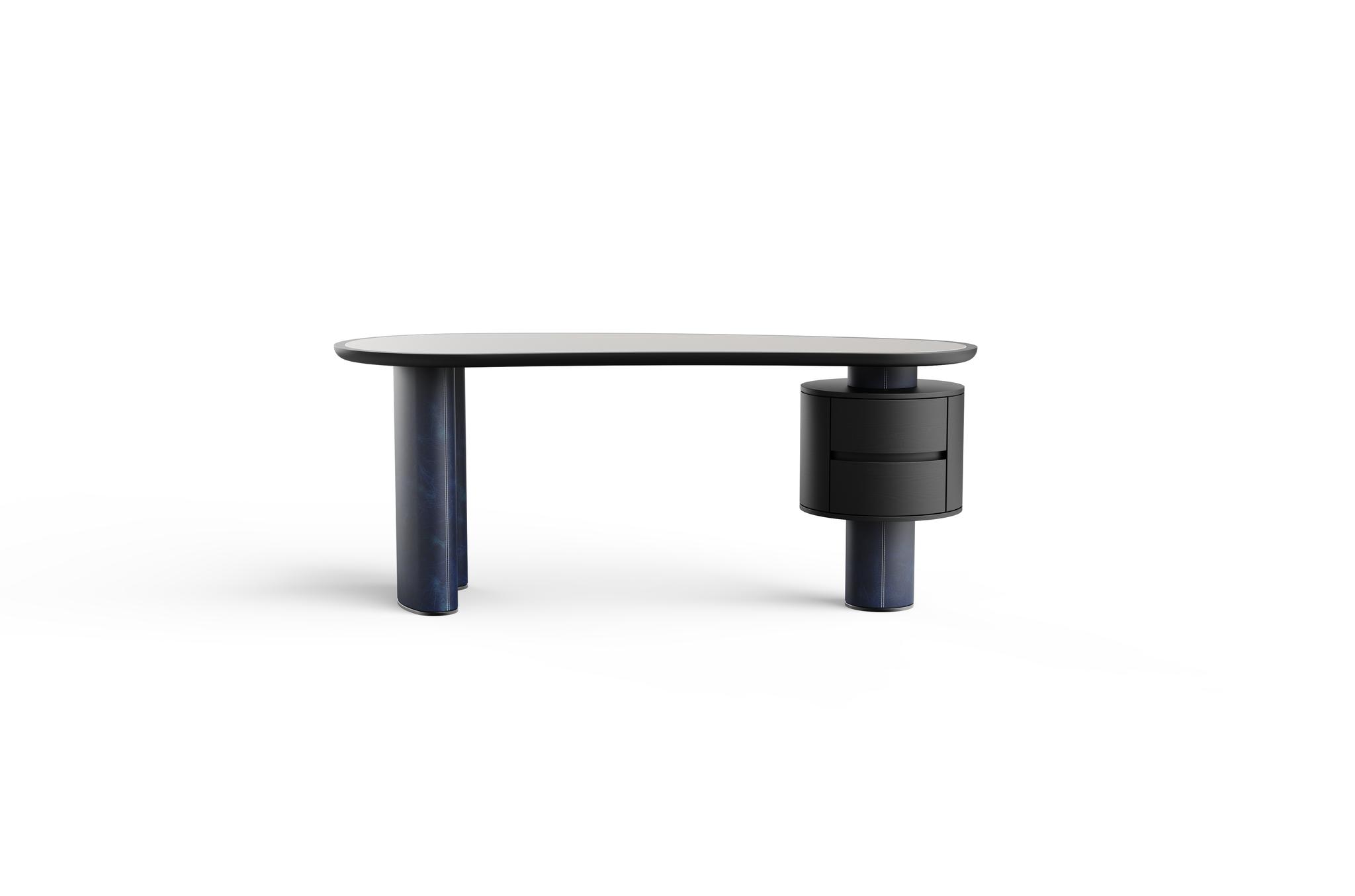 Calira Desk brings refined elegance to the workspace with its soft contours and organic form. A leather-wrapped top framed in wooden moulding rests on sculptural legs—one arched, one cylindrical—both clad in leather and grounded with brushed metal. The cylindrical leg integrates a circular, veneer-finished drawer unit with a subtle pull detail. Calira balances material richness and elegant geometry, creating a workspace that is both functional and visually distinct.