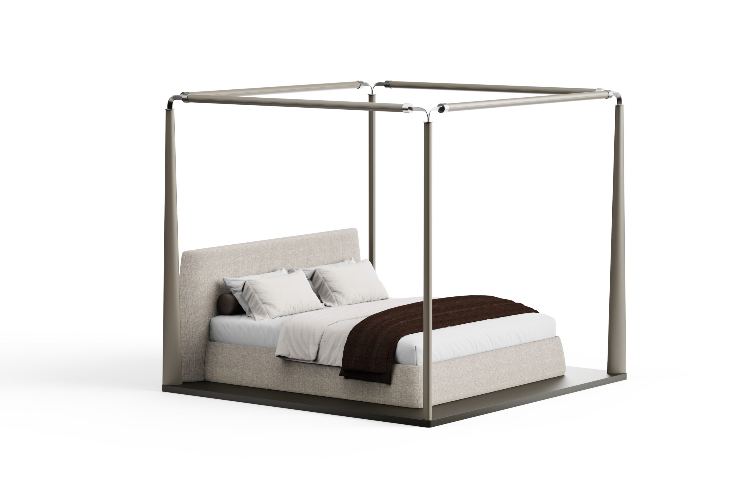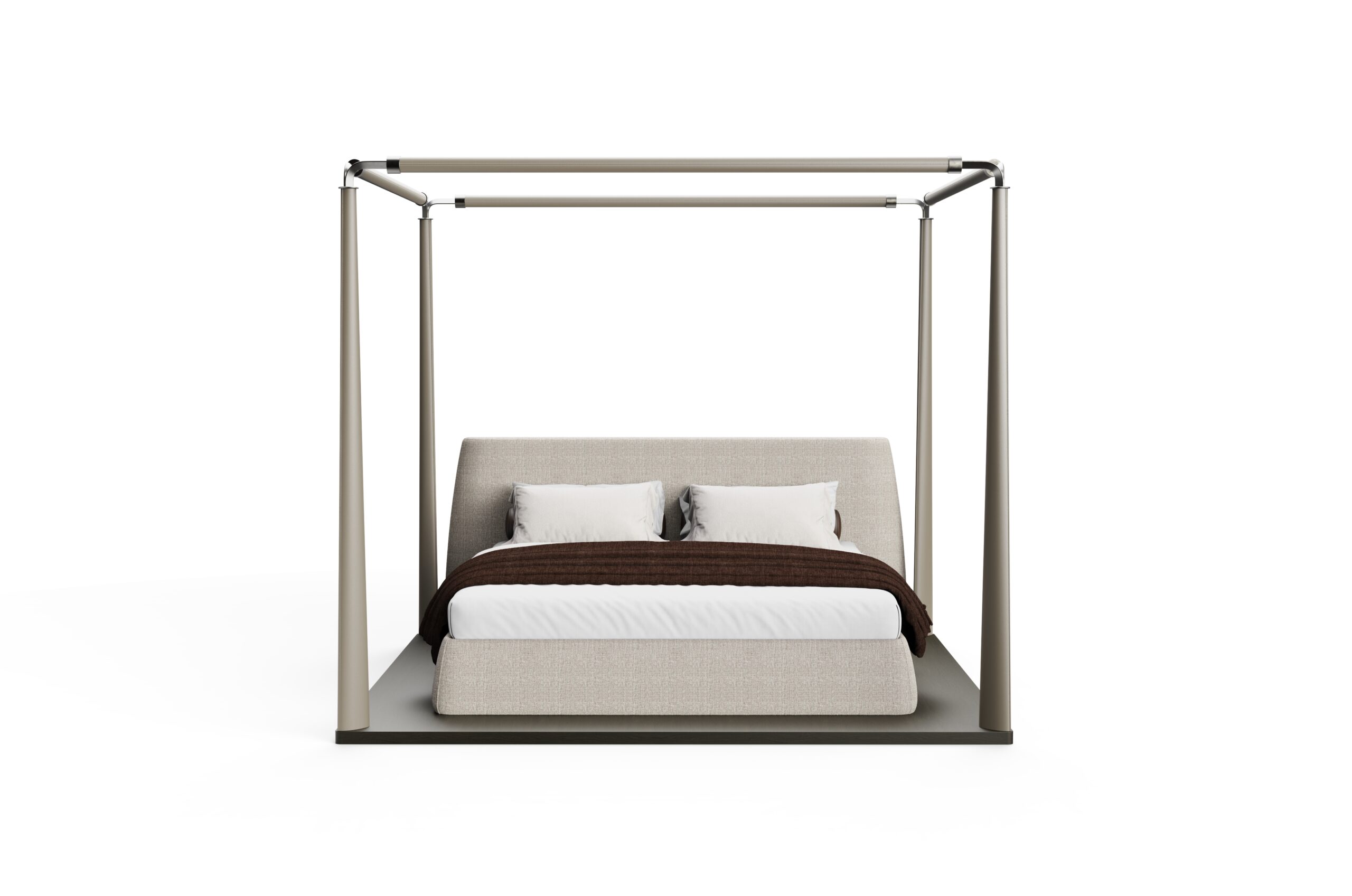 Cavell Bed embodies quiet sophistication through its soft, curvilinear upholstered forms, beautifully balanced by the refined geometry of a four-poster frame. The sculpted headboard rests atop a veneer-finished platform, flowing seamlessly into the gently tapering bed box to create a cohesive silhouette.