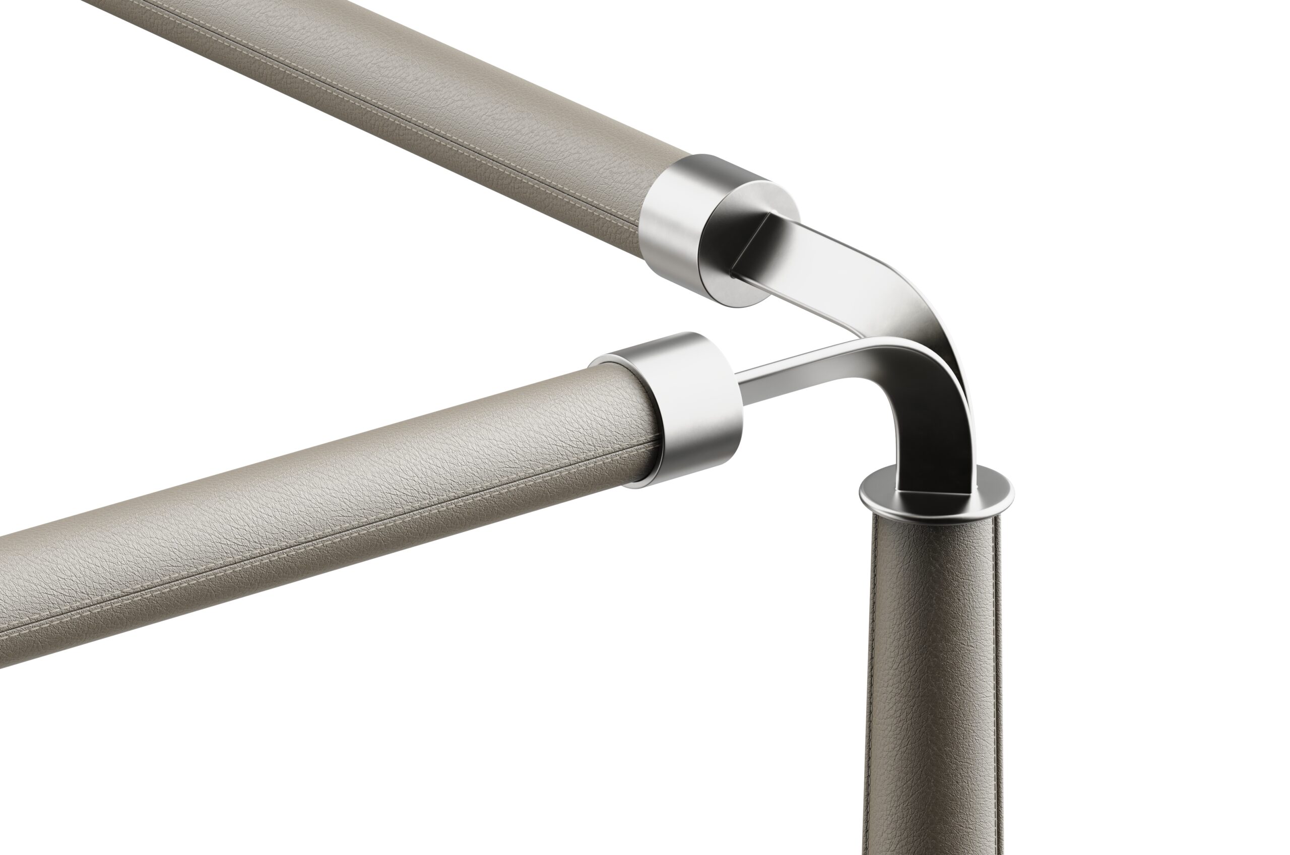Each post features an elegant elliptical profile that subtly transitions into a circular cross-section, wrapped in supple leather and finished with a circular metal cap for a polished touch. At the corners, diverging metal strips connect the posts to horizontal leather-wrapped cross members, creating a sense of lightness and visual openness. The resulting interplay of form and negative space gives Cavell its distinctive, ethereal presence – an artful blend of comfort and architectural grace.