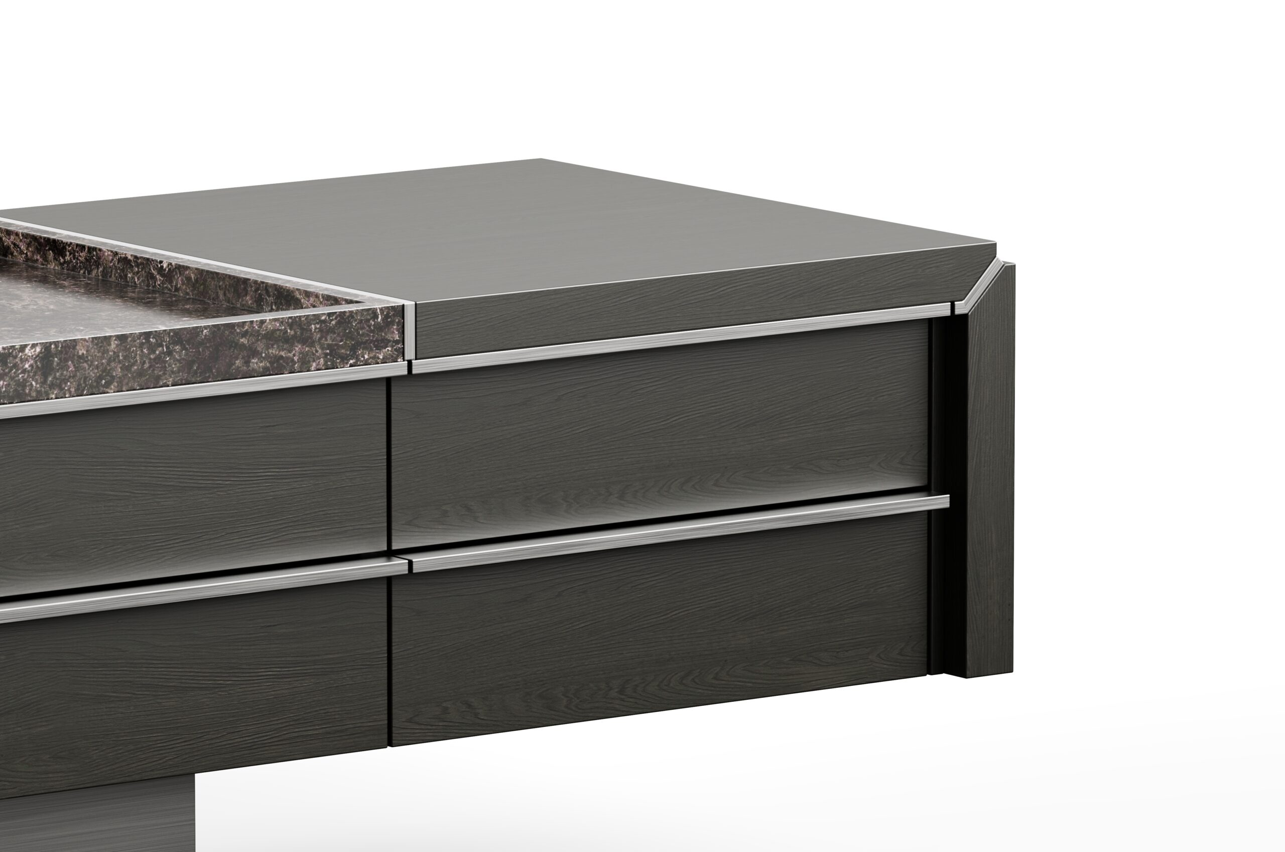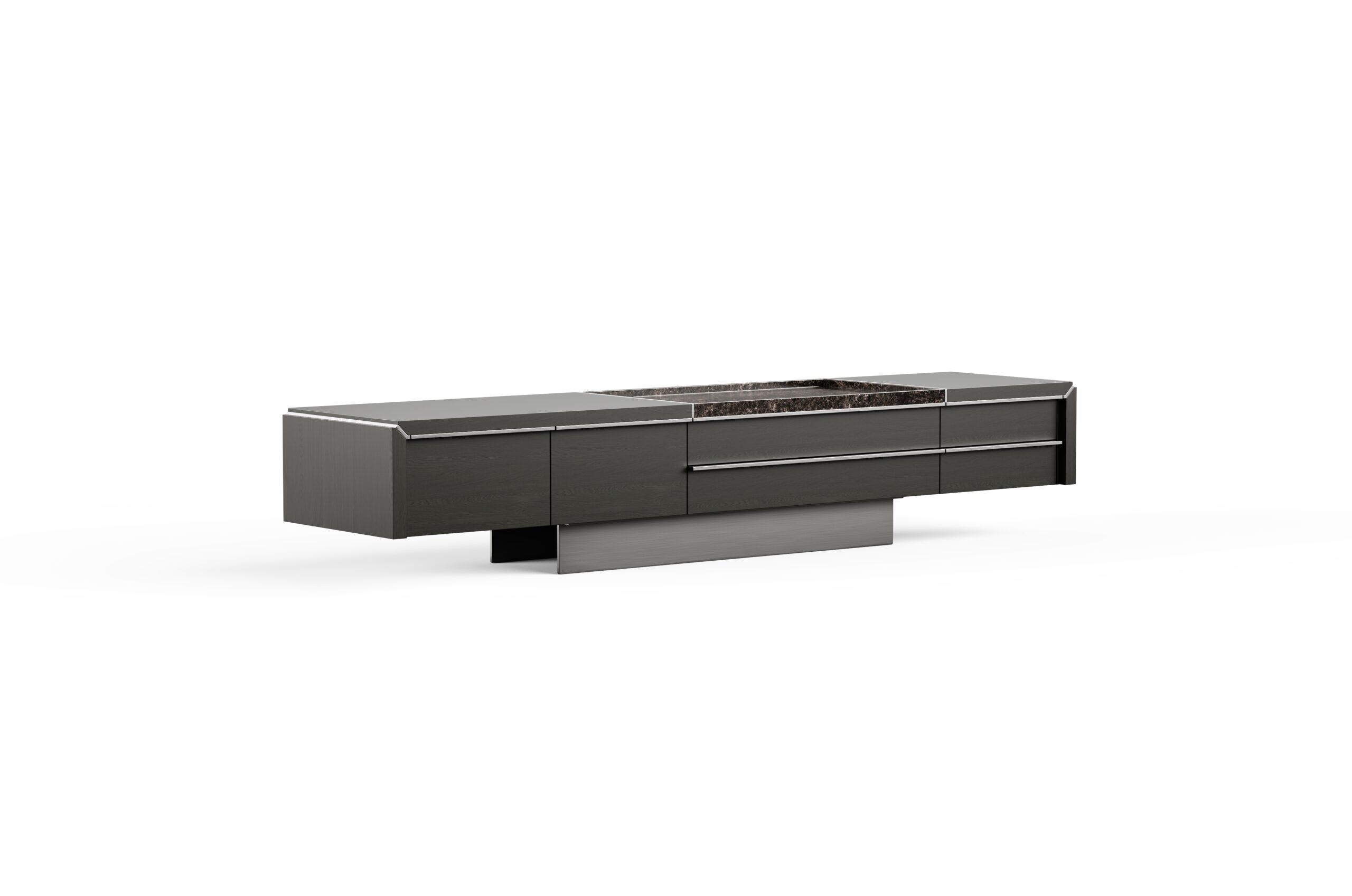Its veneer-finished top features an integrated tray in premium stone, setting a tone of subtle sophistication. Precisely placed metal accents highlight each junction, underscoring the piece’s meticulous craftsmanship.The clean-lined veneered carcass features minimalist drawer and shutter handles that blend seamlessly into the design, offering both function and subtle detailing. Resting on two slim sheet-metal legs, the elongated body appears to float – introducing a sense of visual lightness that contrasts beautifully with its solid presence.