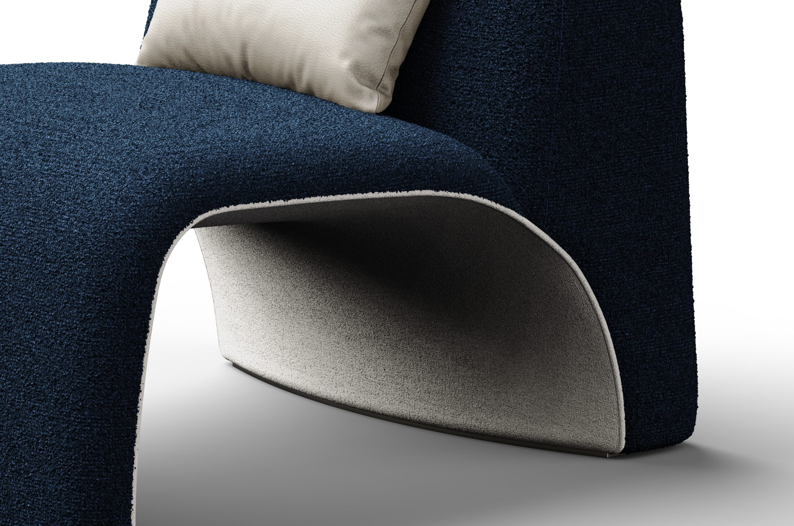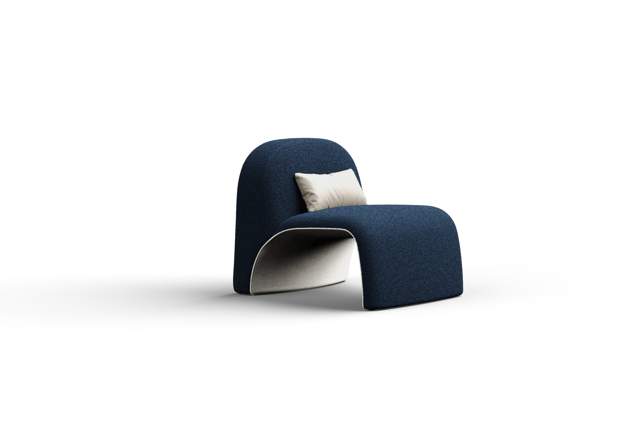 Elva Lounge Chair features a fully upholstered, sculptural form that artfully balances comfort and expressive design. Its curvilinear seat flows seamlessly into a plush backrest, creating a fluid, inviting silhouette. At the center, a distinctive void reveals a contrasting inner fabric – evoking the metaphor of fruit, with a soft, tender interior revealed beneath a vibrant outer skin. Framed by refined piping, this layered detail adds depth, texture, and visual intrigue.