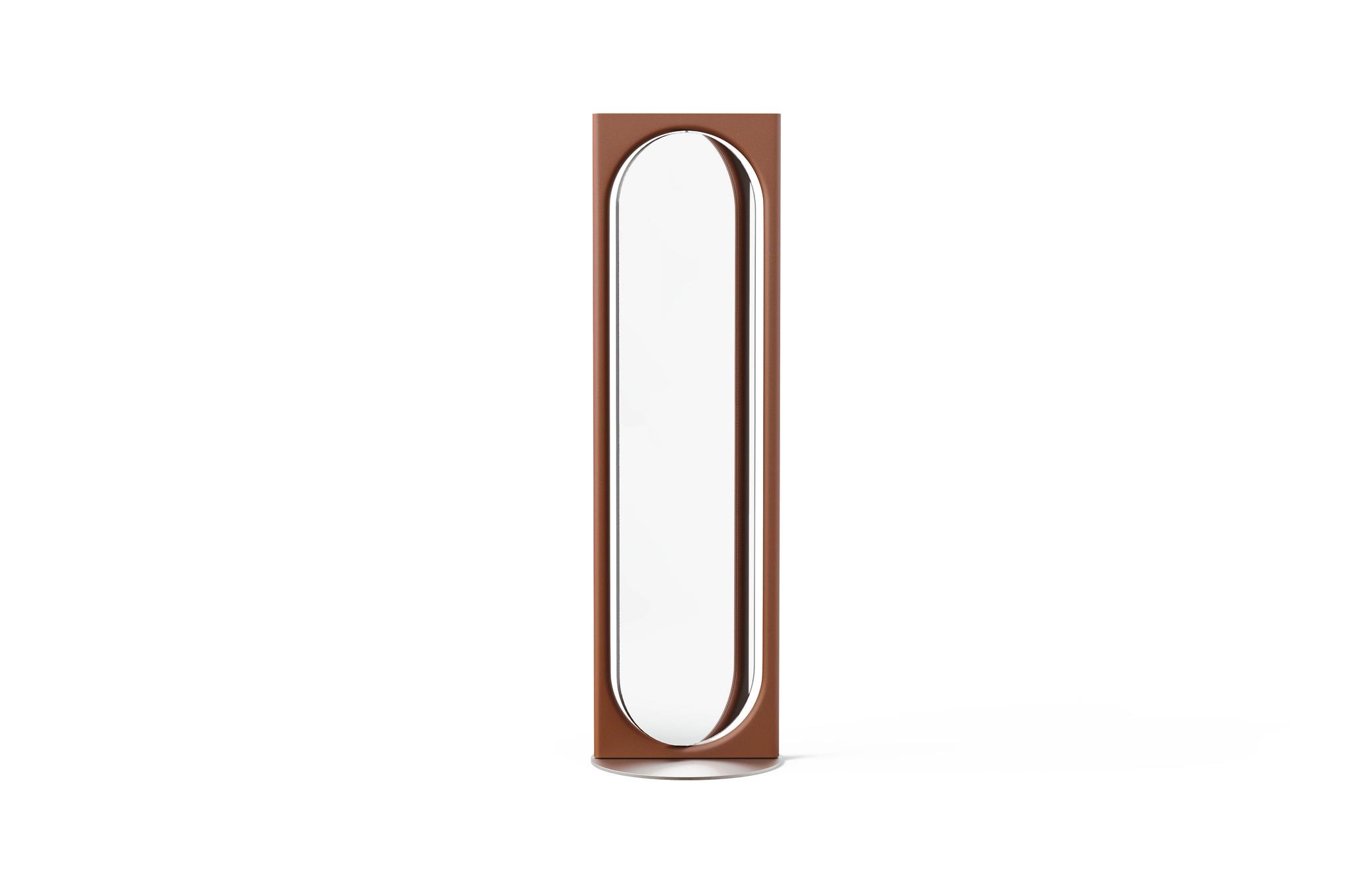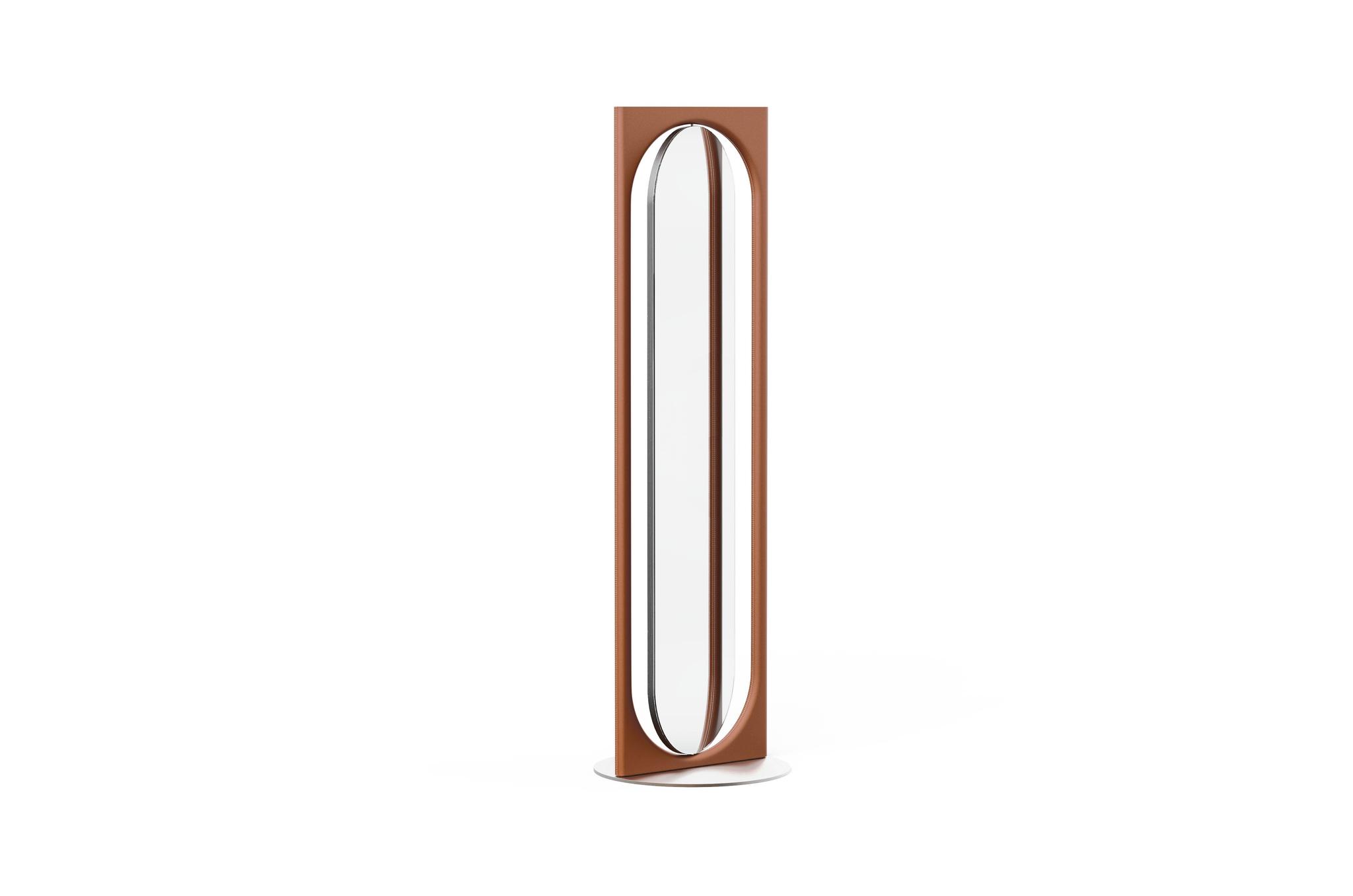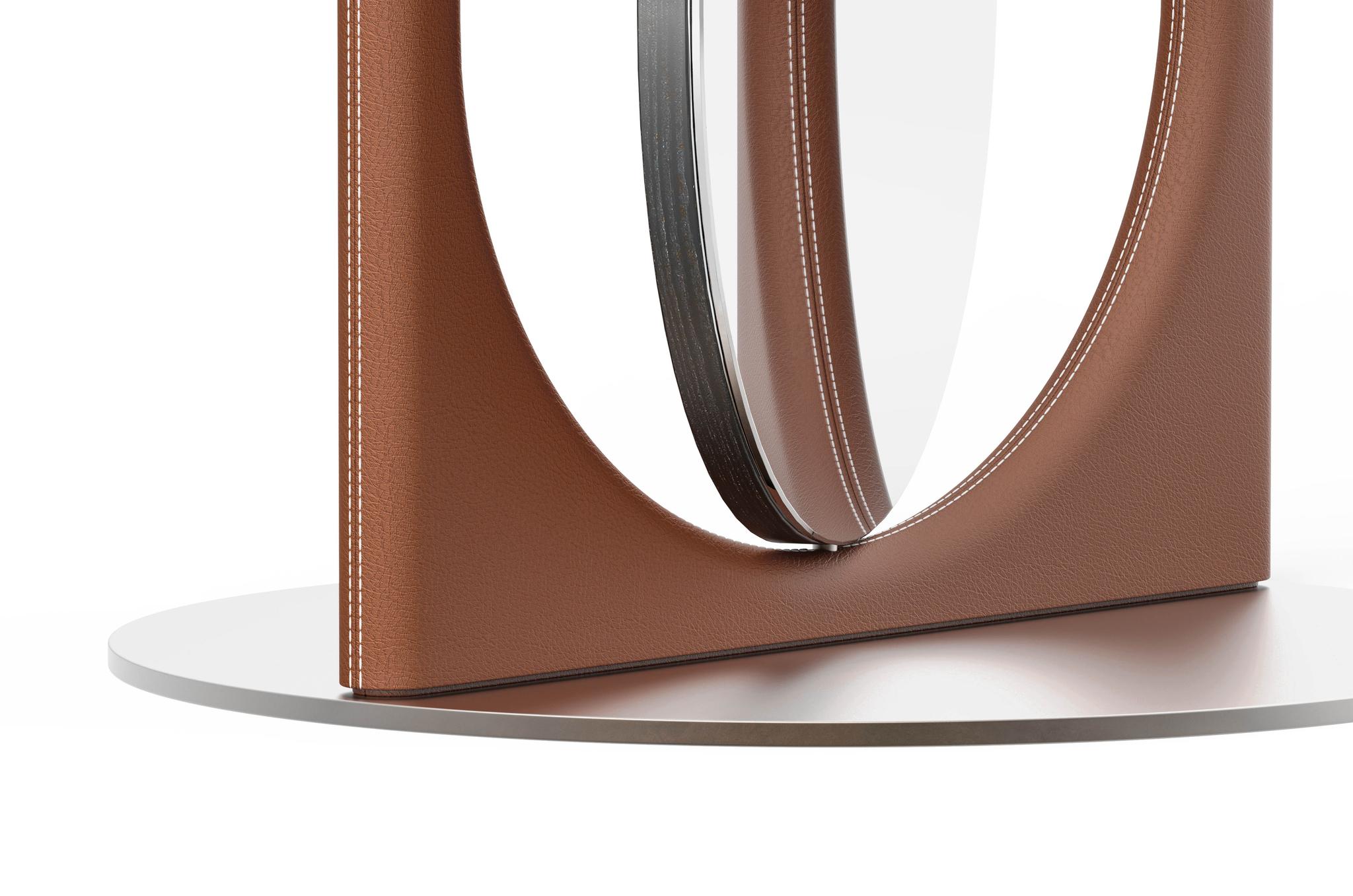 Elyas Mirror features a slender, sculptural form with rounded edges framing an oblong, pivoting mirror. As it tilts within its recess, the softly curved interior creates a fluid, seamless visual flow. Available in full-length and face variants, Elyas combines a rich veneer body with a leather-wrapped frame and a sturdy sheet metal base. Blending vintage charm with modern geometry, it offers elegance, function, and timeless appeal to any space.