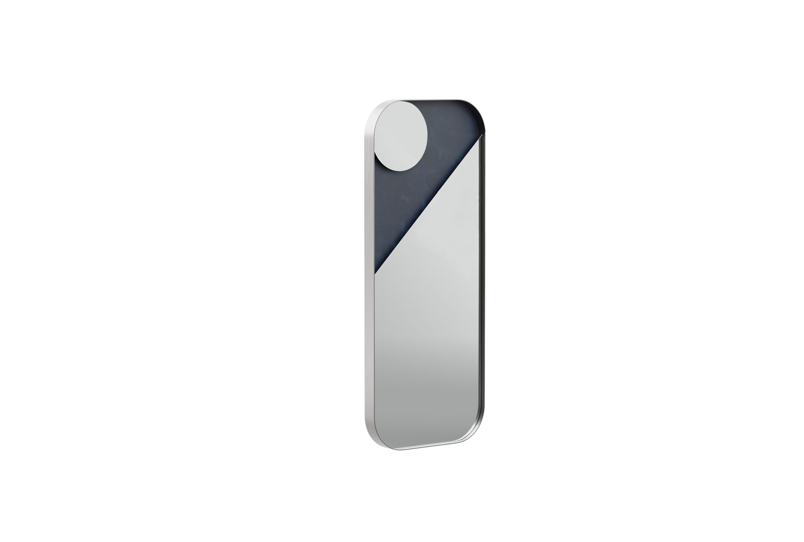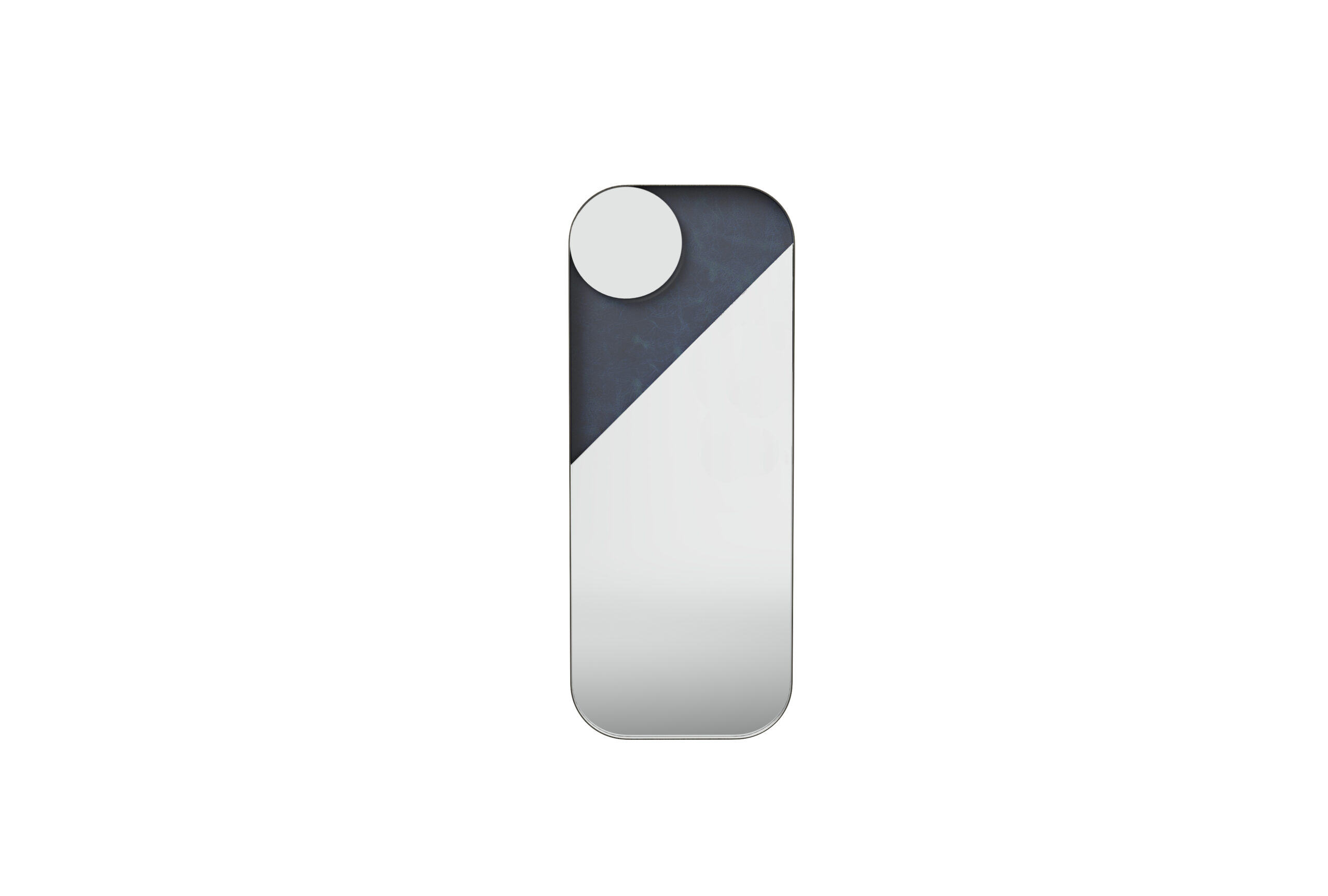 Its layered design creates a dynamic interplay of surfaces, with premium leather subtly revealed beneath the mirror panels, adding a soft, tactile contrast. The geometric mirror shapes are artfully framed by a sleek metal border with rounded corners, offering a clean yet distinctive silhouette.Backlit with integrated LEDs, the mirror panels appear to float above the leather-clad interior frame – evoking the ethereal presence of celestial objects and enhancing the ambient atmosphere.