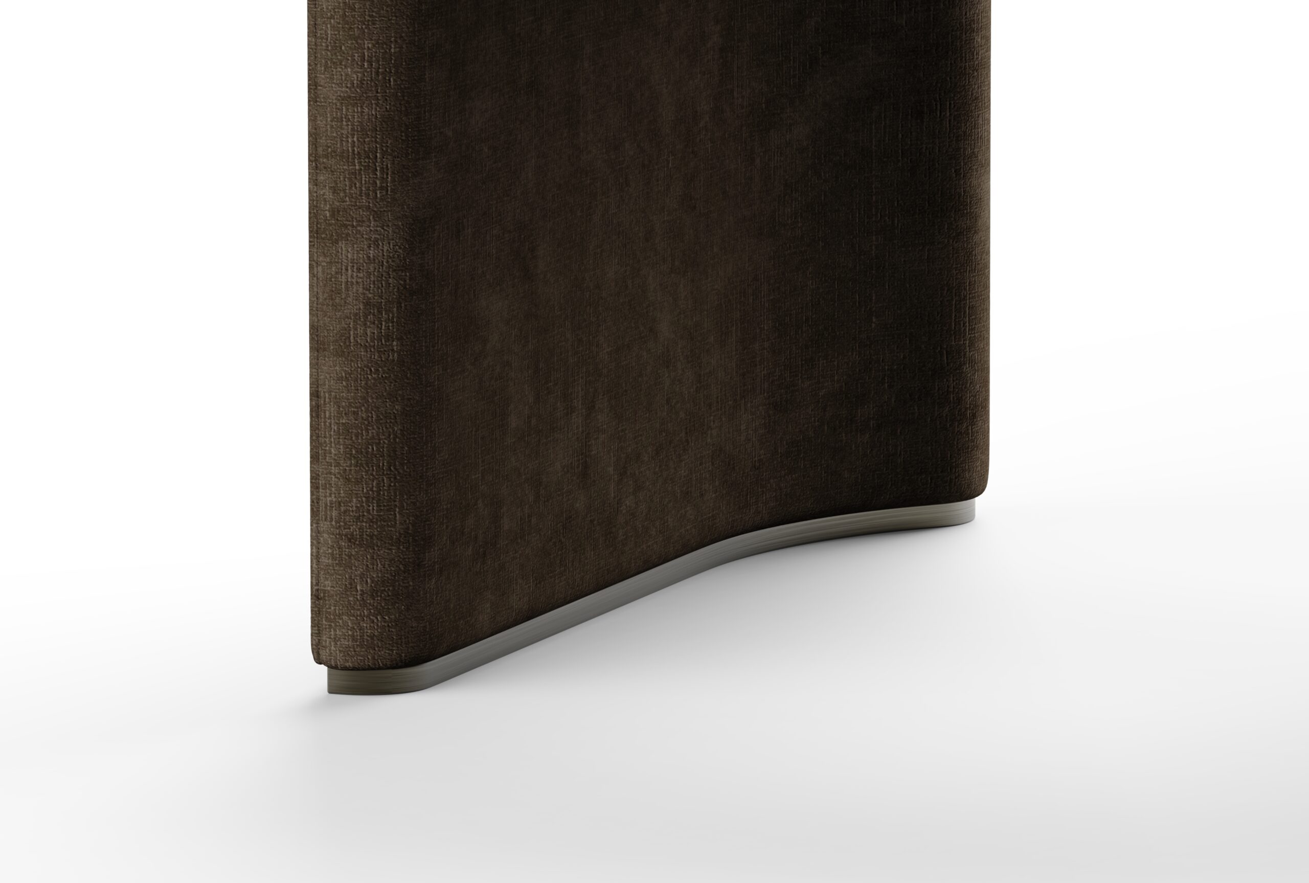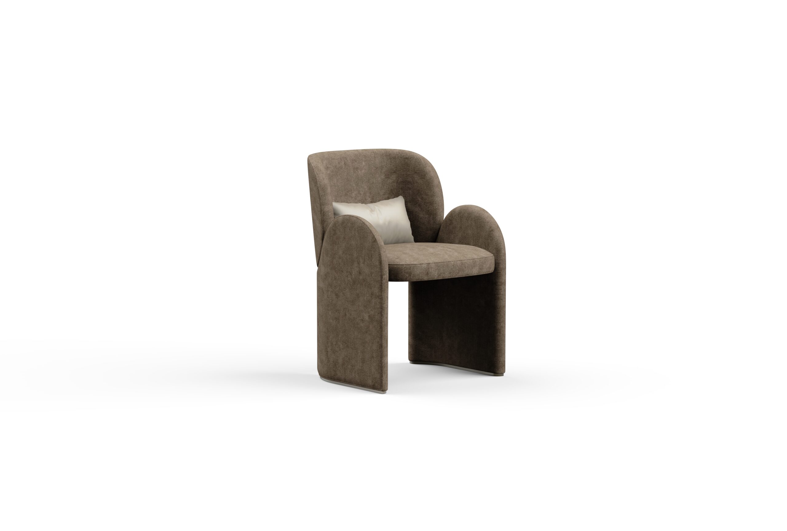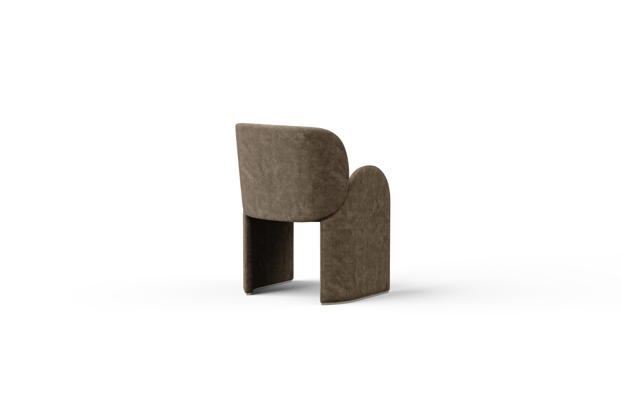 Its fully upholstered form features harmoniously contoured backrest and side panels, whose matching profiles create a snug, seamless fit – adding a distinctive design expression and visual rhythm. The slender yet supportive seat is gently embraced by the flowing armrests, balancing elegance with comfort. Subtle metal accents at the base not only protect the upholstery but also emphasize the sculptural form with a refined finish.