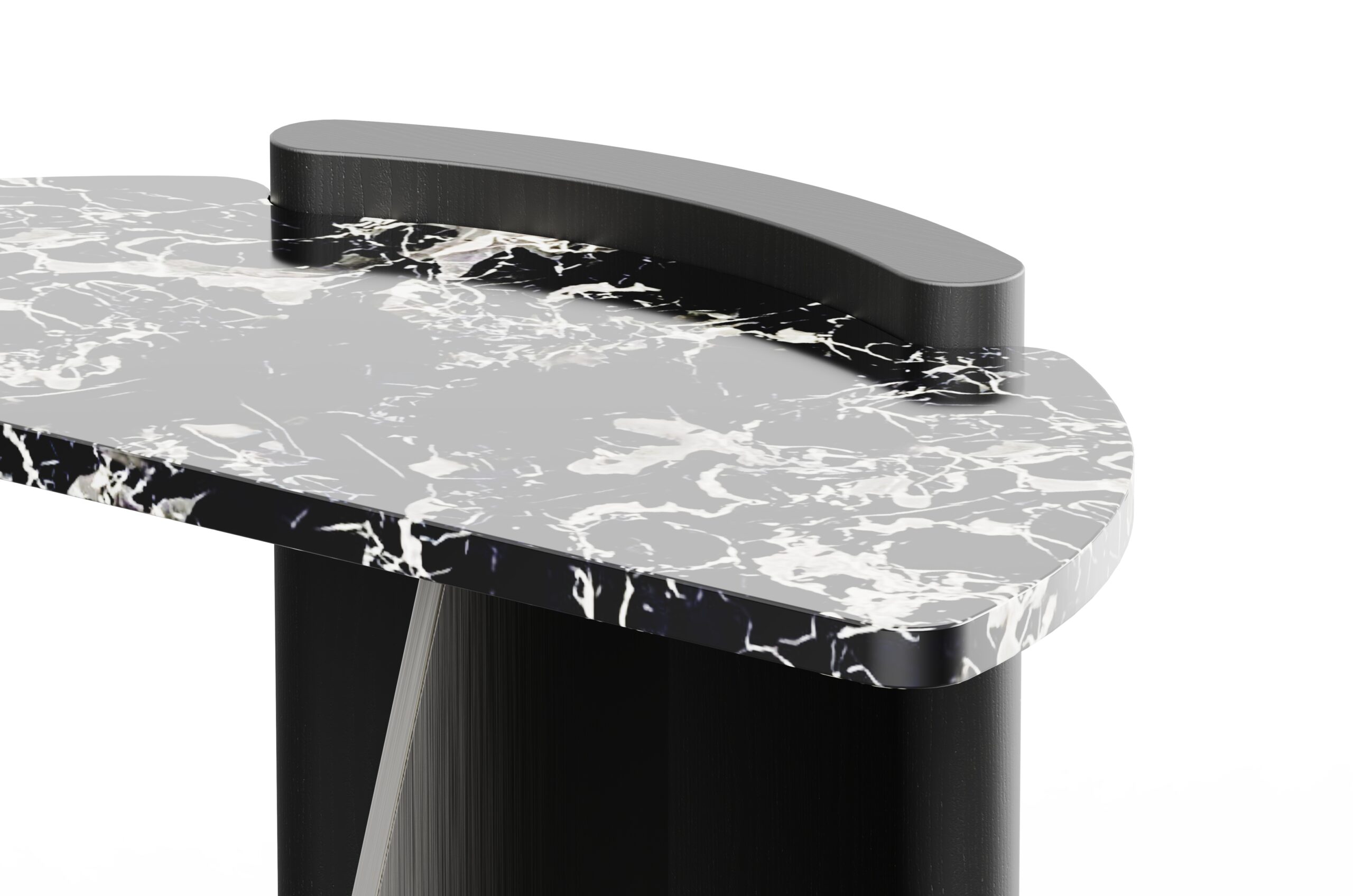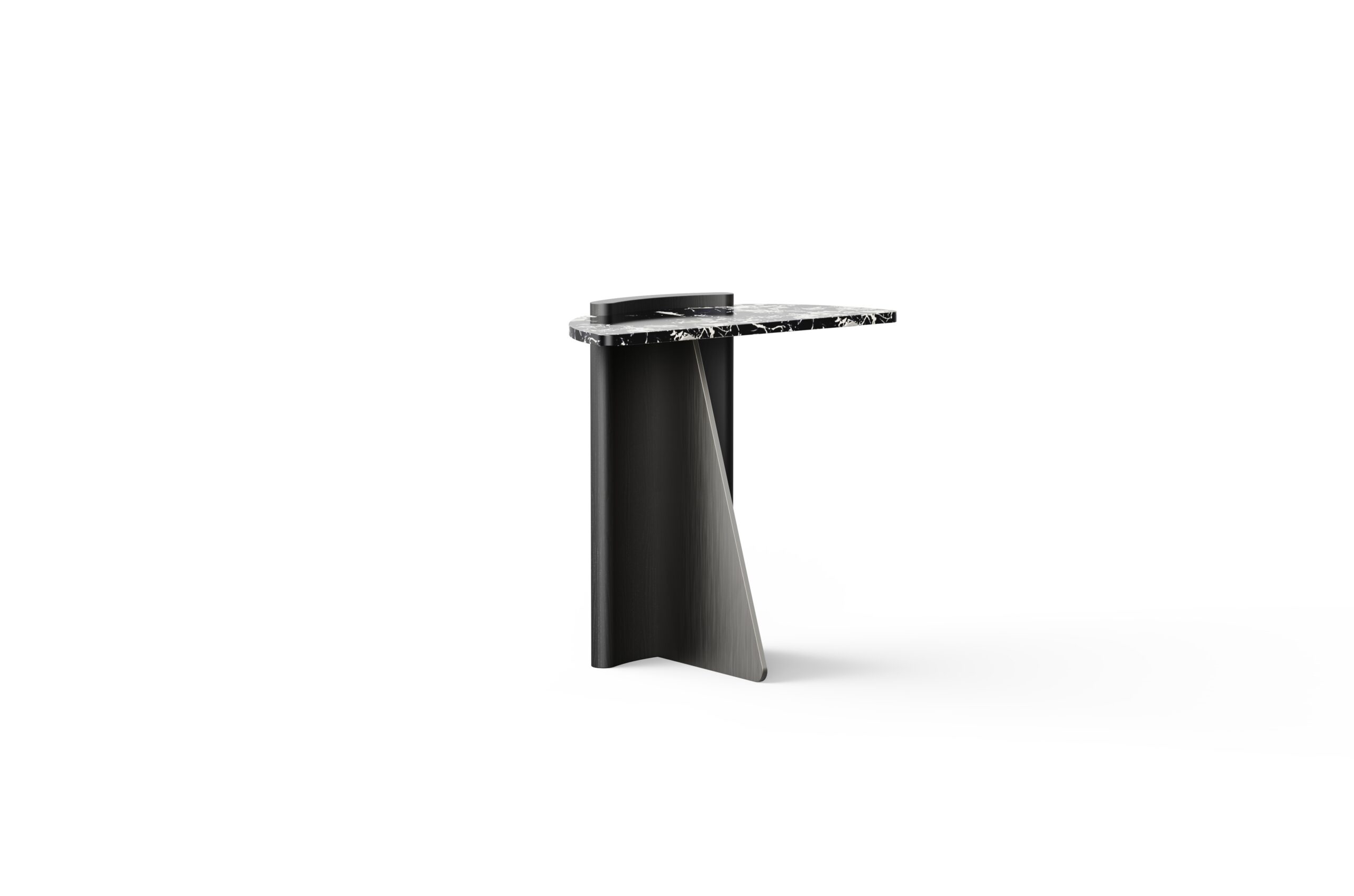 Adding bold contrast, a triangular sheet metal leg intersects the back, introducing angular tension that offsets the table’s soft arcs. The result is a minimal yet grounded composition – where elegance meets geometry in a sculptural, functional piece.