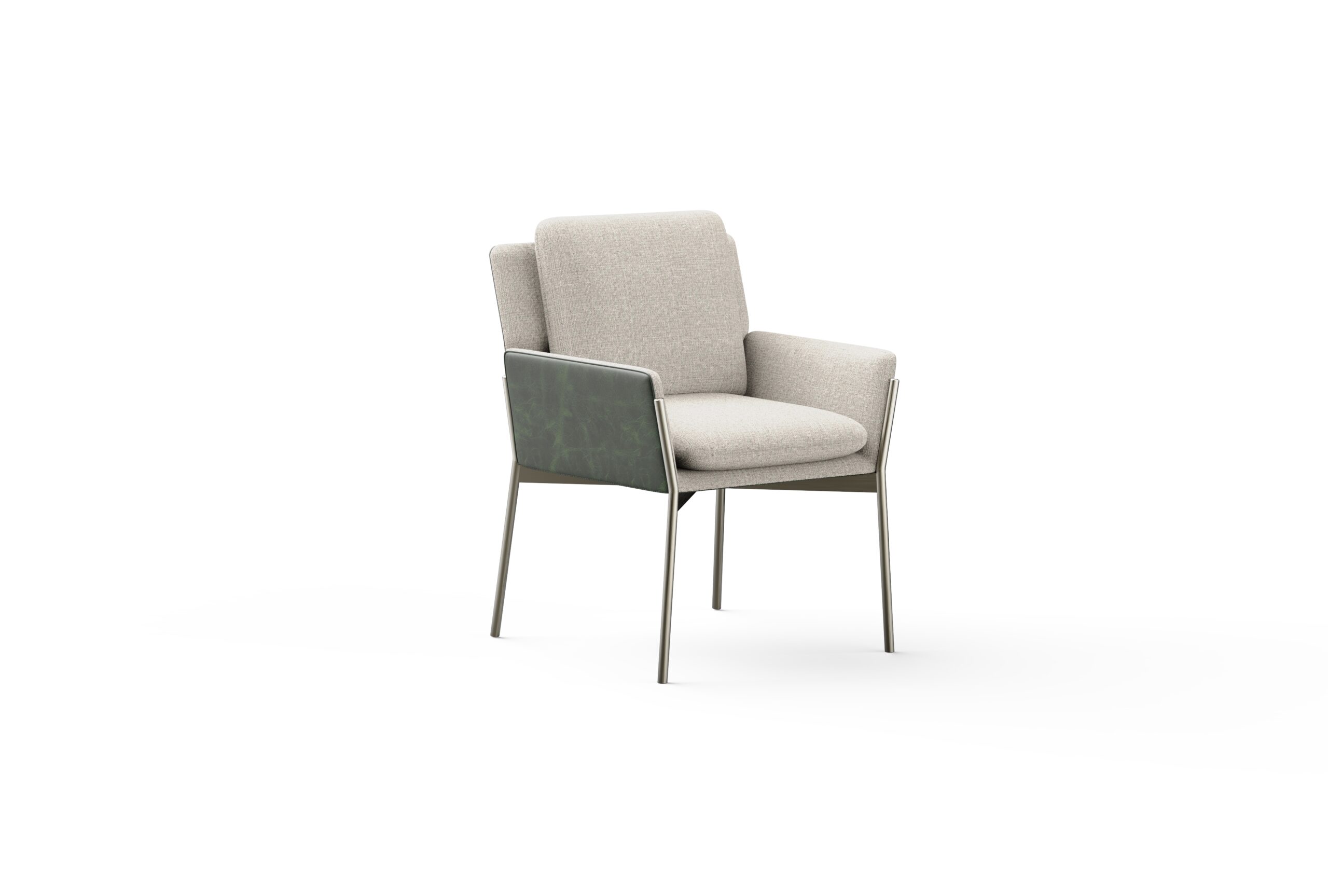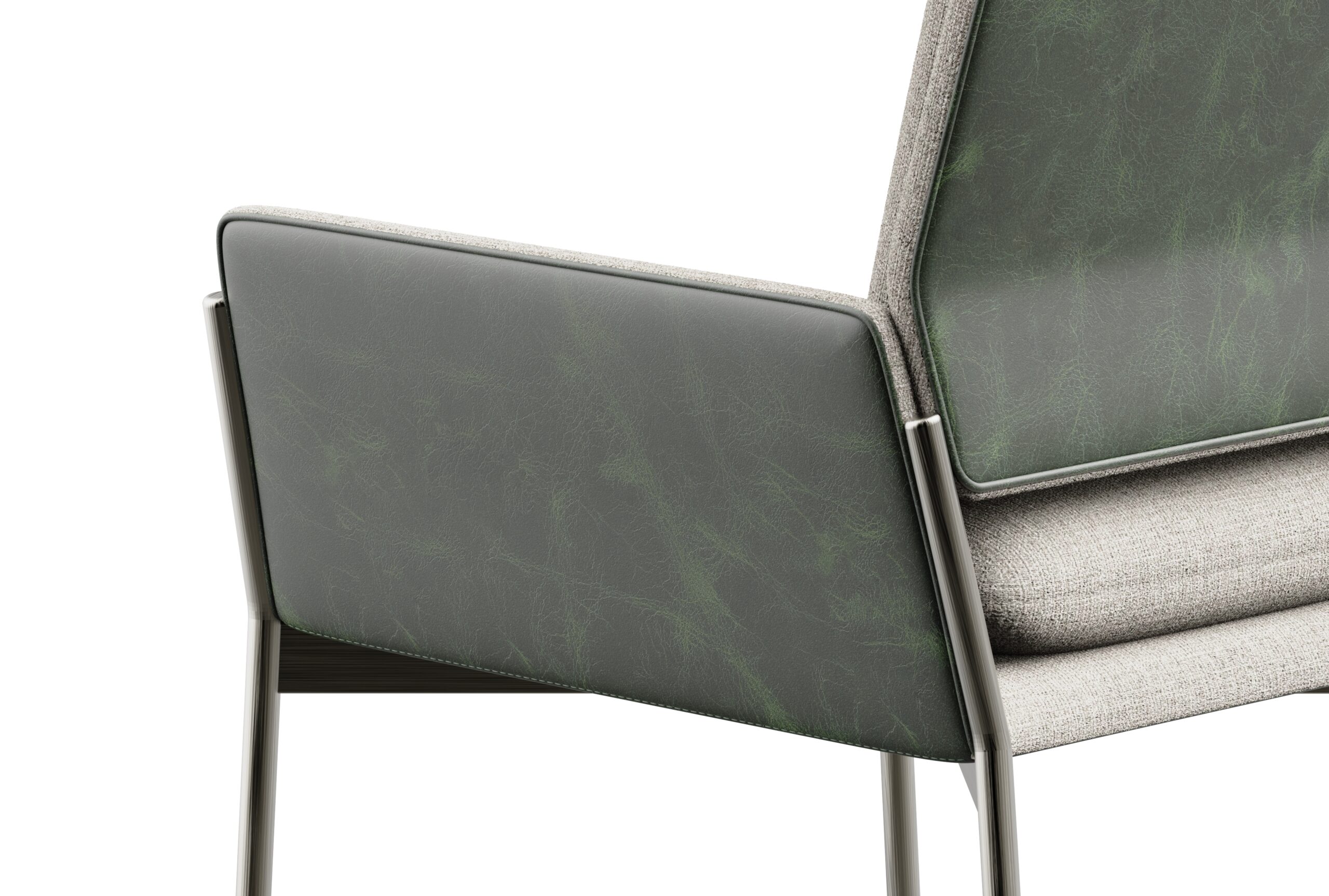 Its form gently flares outward from the sides and back, creating an open, inviting feel. The armrests and backrest are upholstered and finished in luxurious leather on the exterior, adding a touch of sophistication to its sleek silhouette.A robust metal frame supports the chair from all sides, accentuating the sense that the upholstered section is gracefully lifted within the structure. Available in double combined fabric options, the Mirel chair offers a personalized touch to suit your aesthetic.