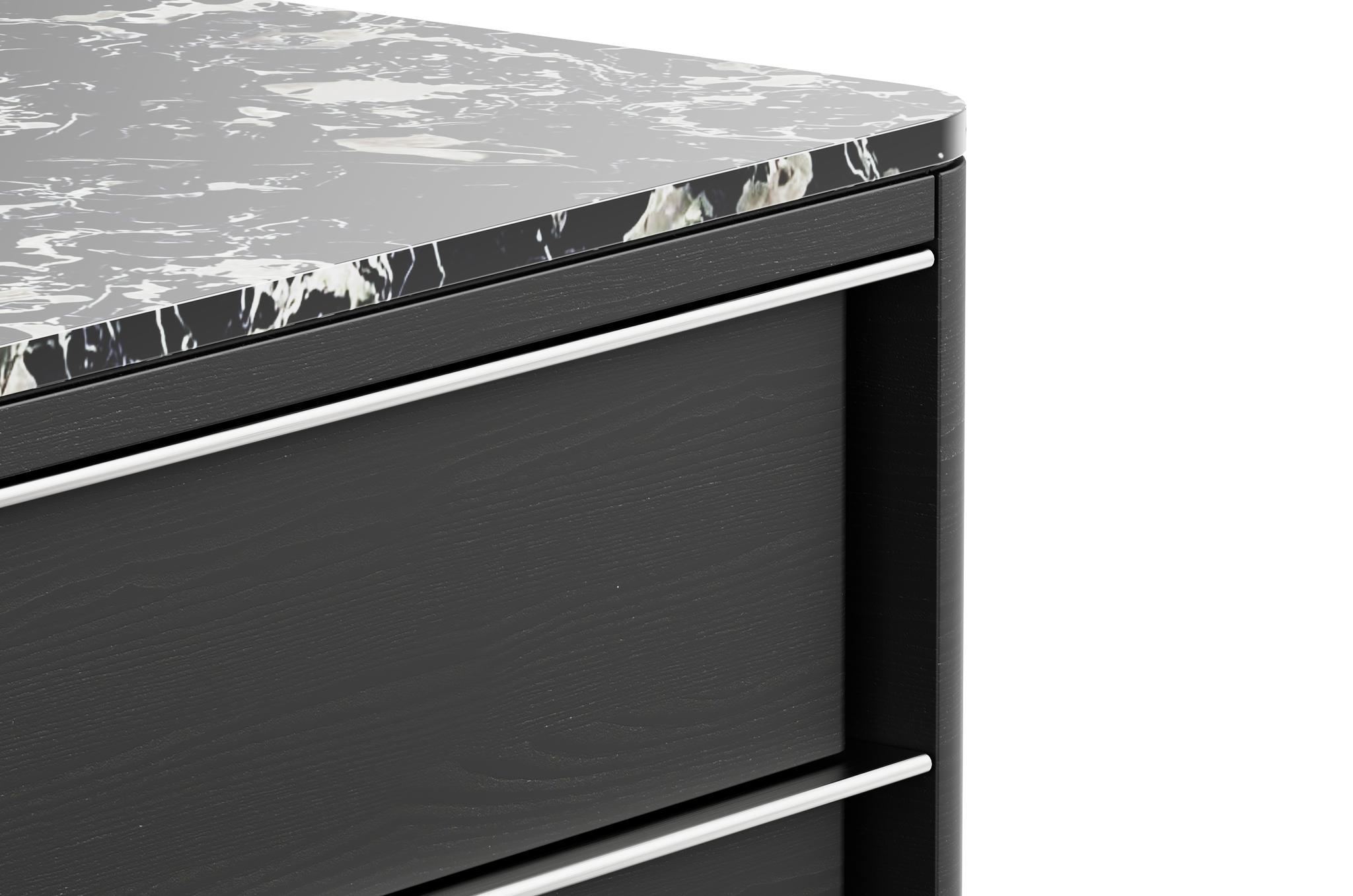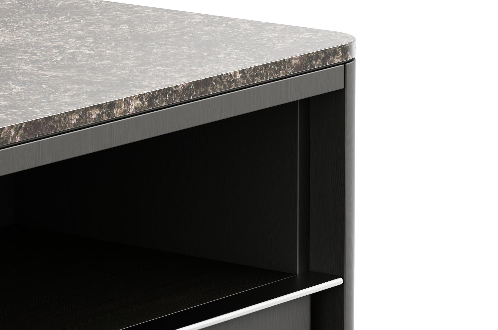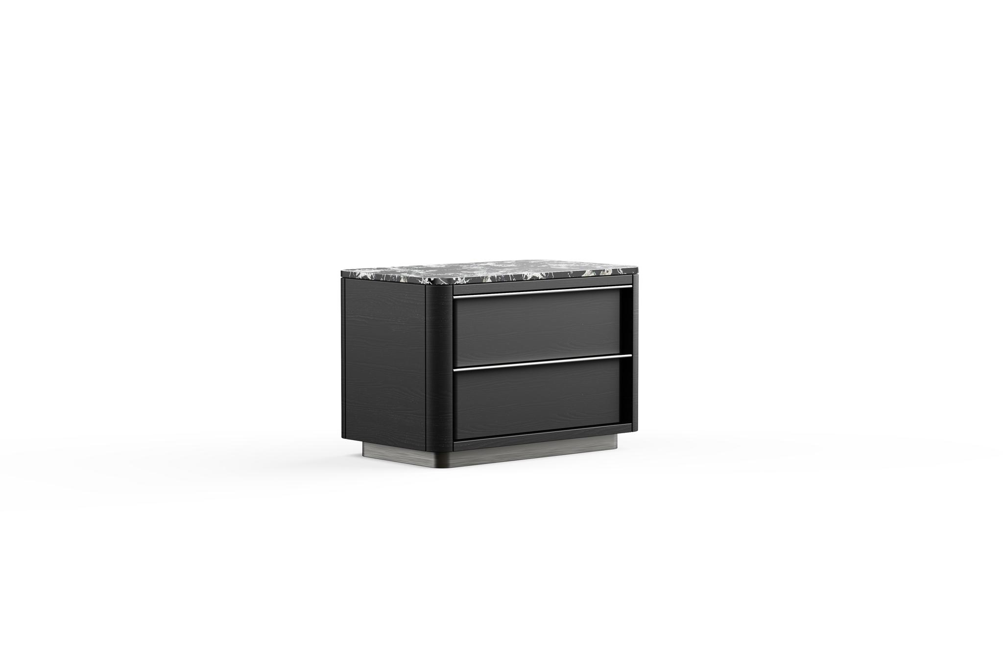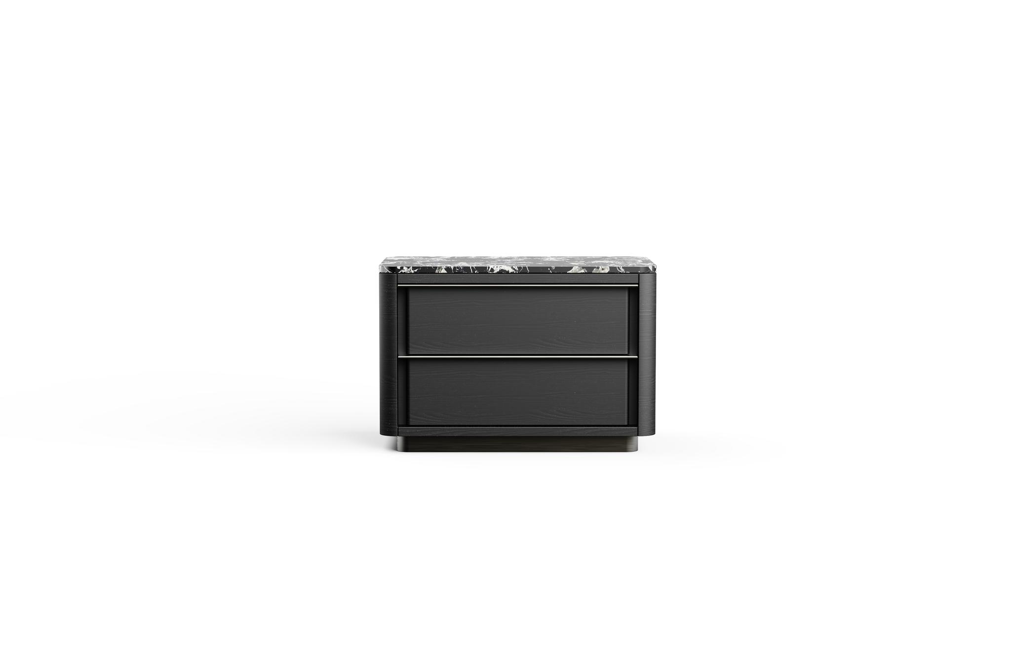 Morven Bedside Table pairs refined detailing with practical design, featuring softly rounded corners and a luxurious polished stone top. Available in two configurations—one with a drawer and open shelf, and another with dual drawers—it offers flexibility in storage. Flanking gaps around the drawer fascia add a sculptural touch, while a brushed metal handle and matching skirting accent the rich veneer with subtle sophistication.