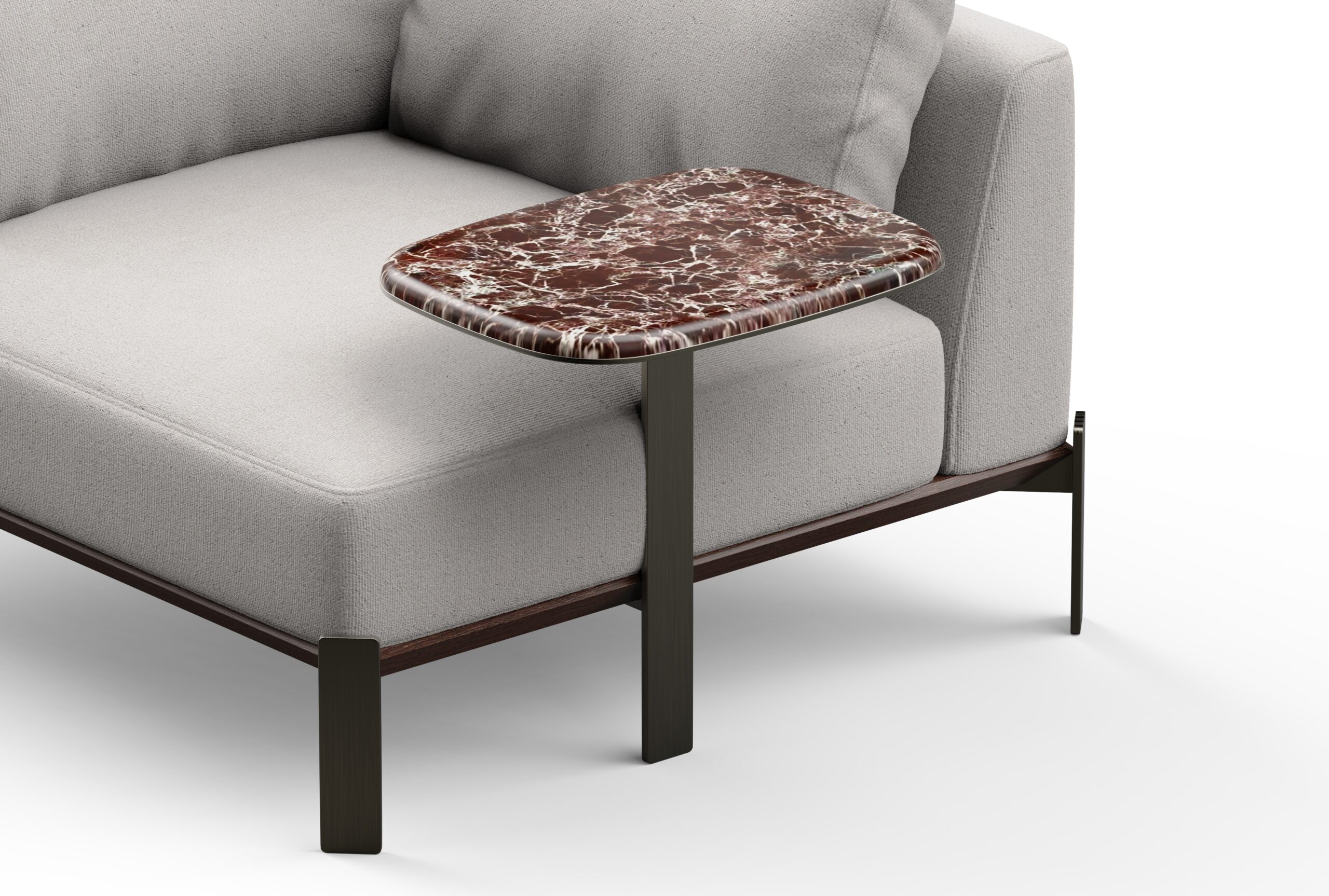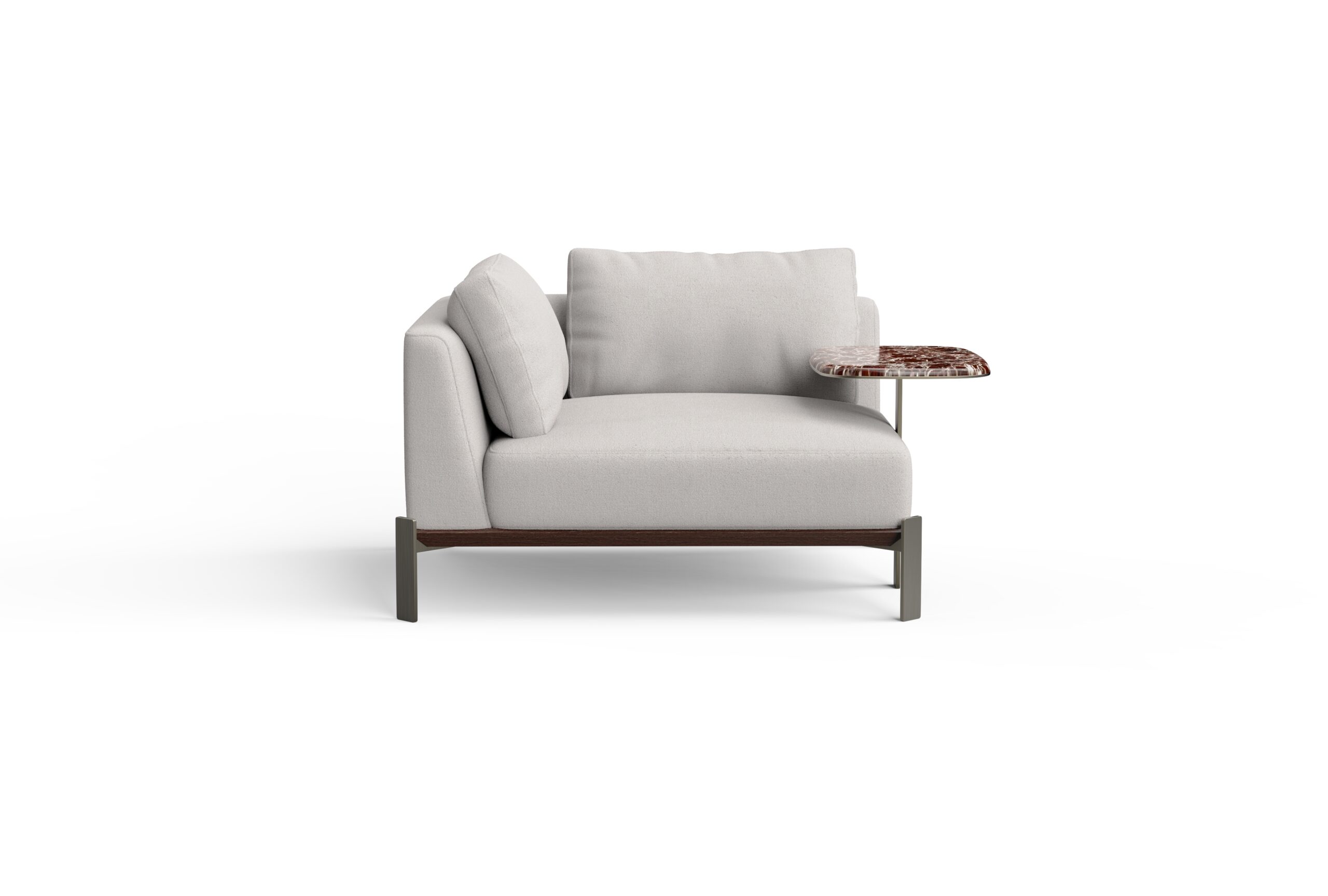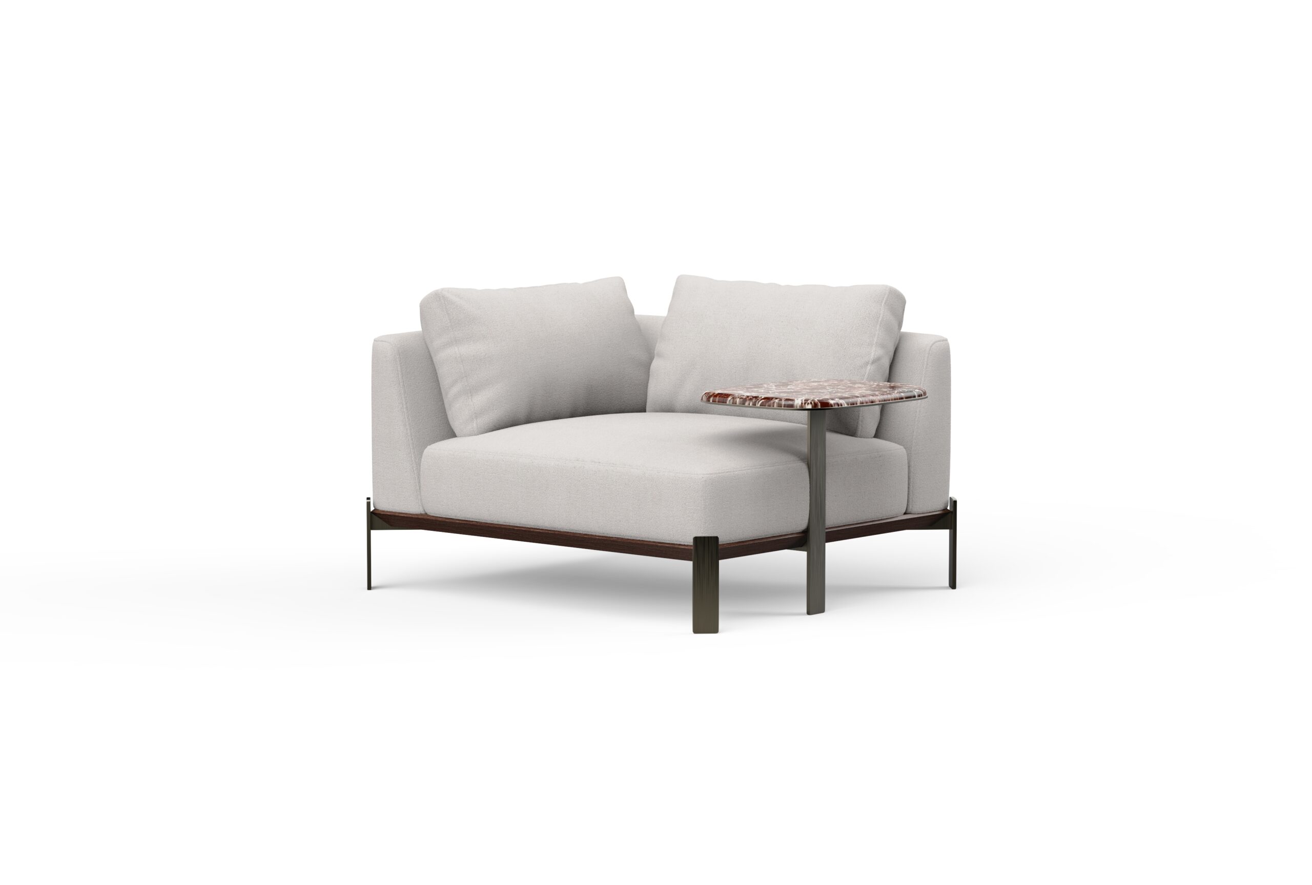 The seat and L-shaped backrest form a comfortable corner, featuring clean, angular lines that maintain a sleek, contemporary silhouette. The side table, supported by a slender metallic leg, is available with a polished stone or solid wood top on either side of the chair, introducing a subtle yet striking visual contrast. A double-chamfered wooden base paired with sleek metal legs enhances the dynamic interplay of straight and angled forms throughout the design.