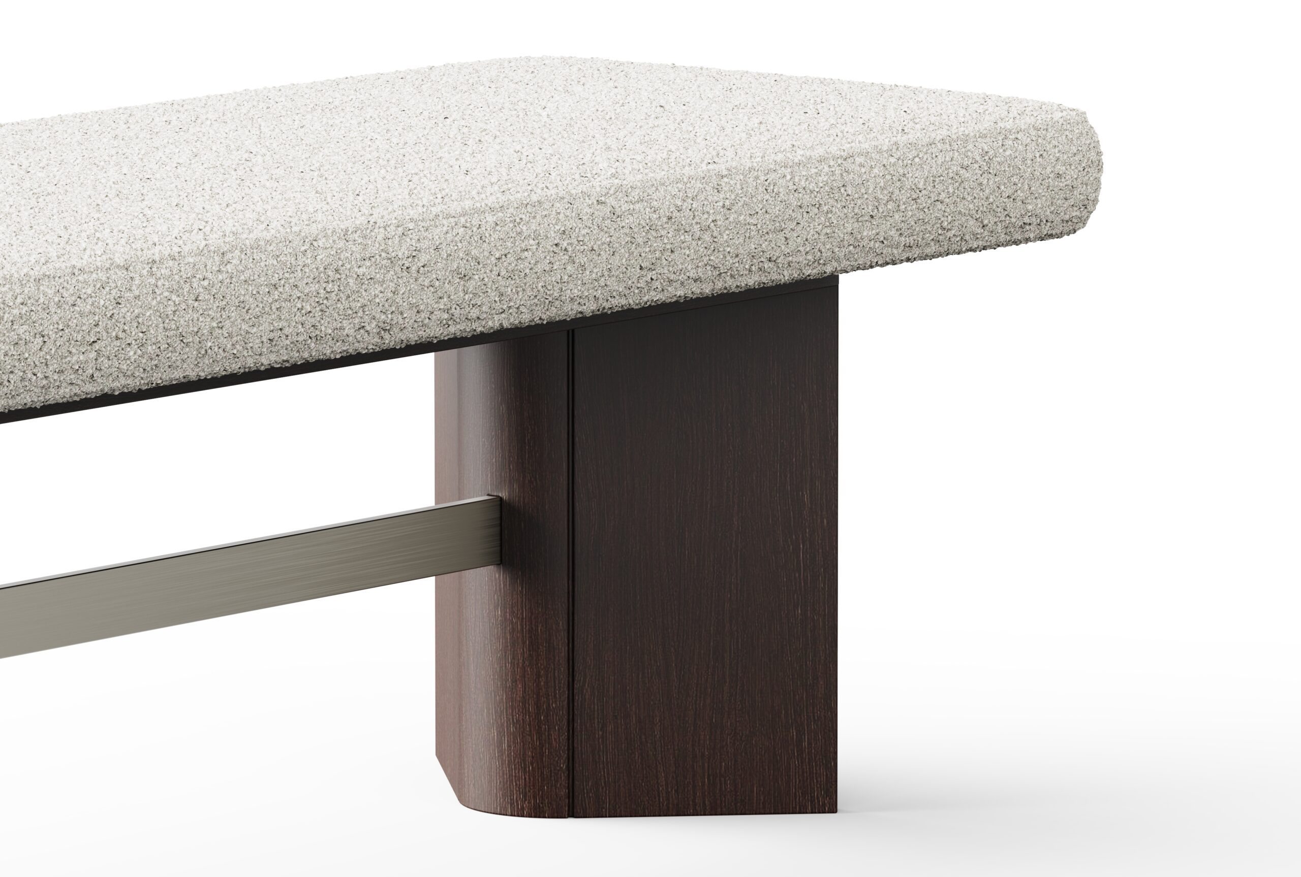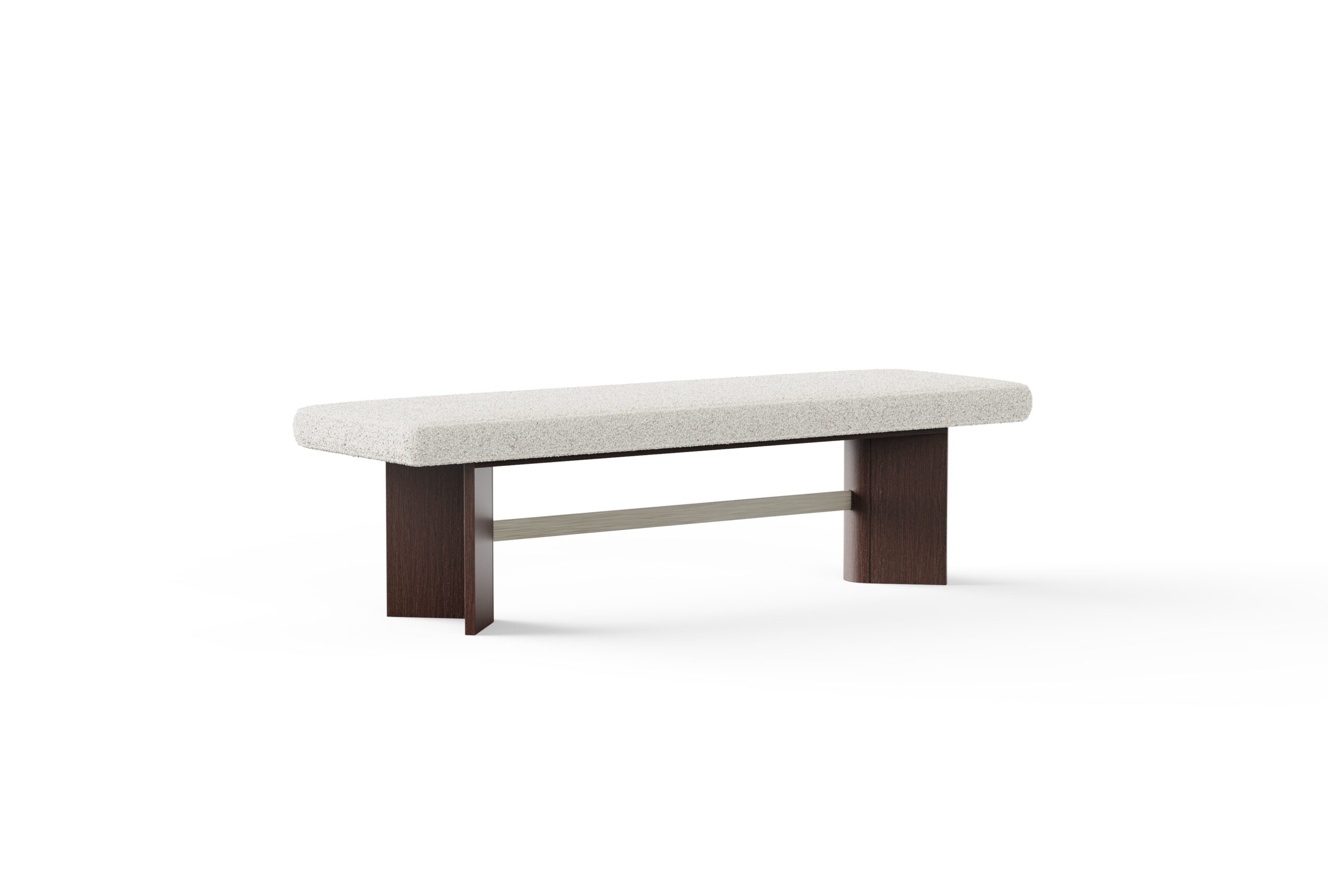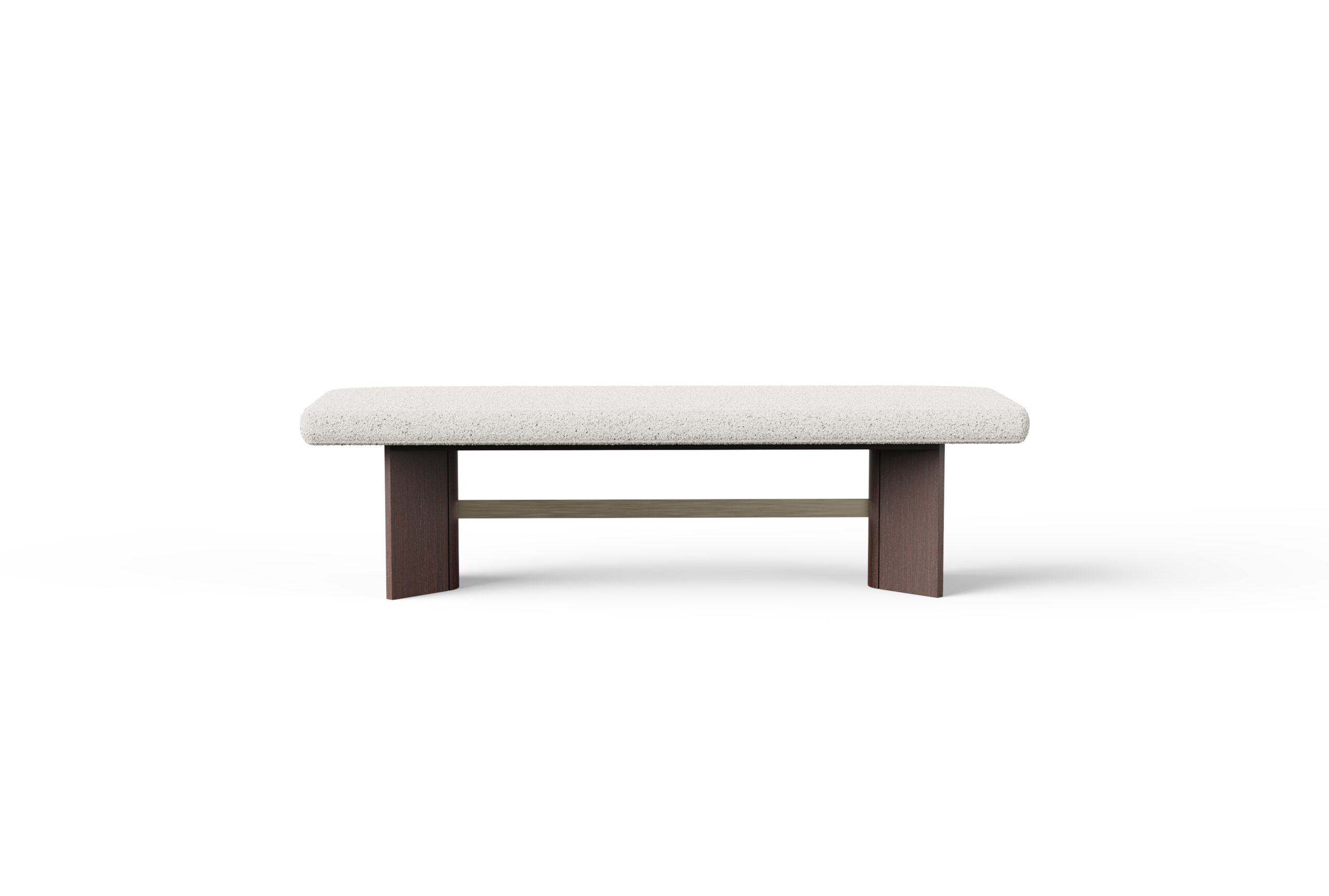Its elongated, upholstered seat offers a refined sense of comfort, anchored by a sculptural base in a rich veneer finish and distinctively bent legs that introduce a sense of movement and fluidity. A slender horizontal metal detail spans the negative space between the legs, lending structural coherence and a subtle metallic accent that elevates the overall aesthetic.