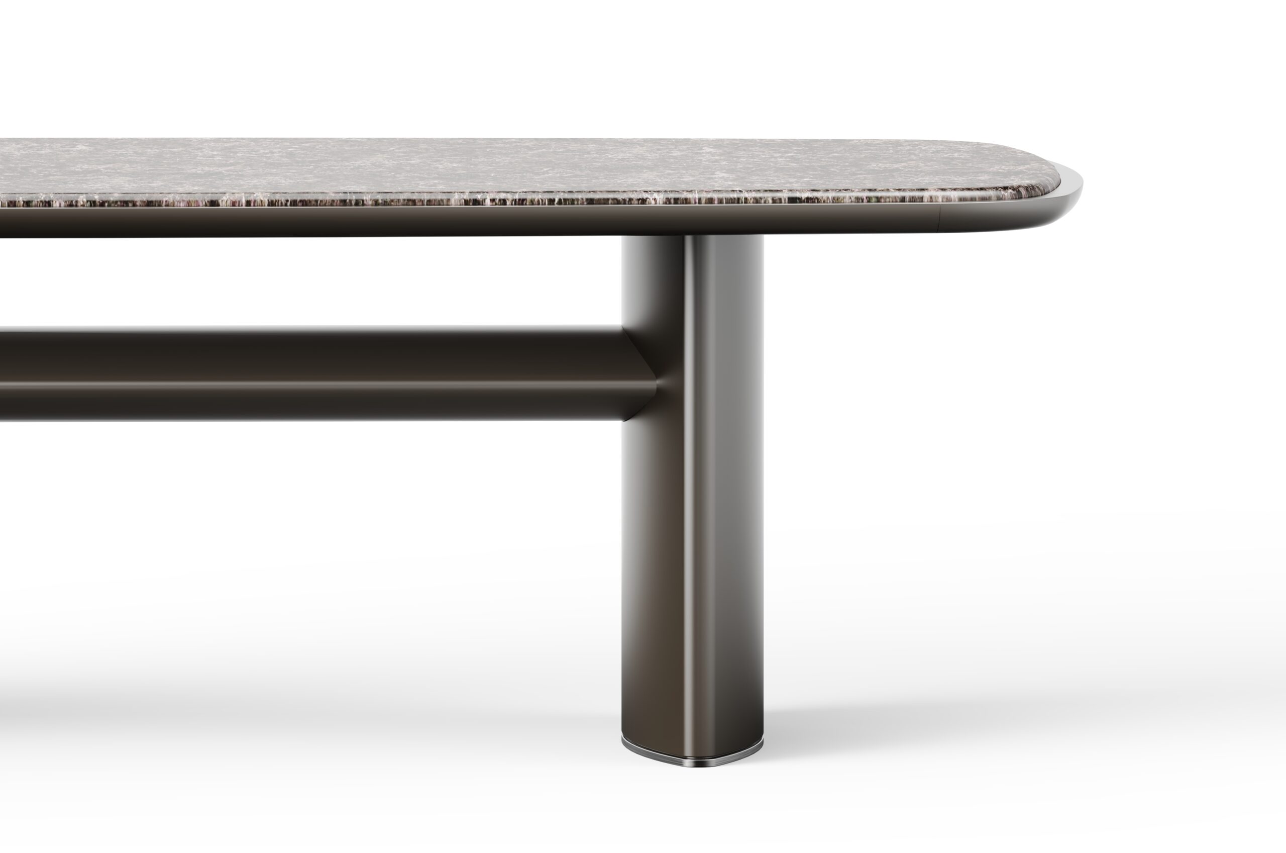 Beneath, a substantial lacquered surface with gently curved edges mirrors the top’s form, reinforcing its cohesive design language. The base features two oval-shaped legs, connected by a matching horizontal element, creating depth through the dynamic meeting of curves. Finished with sleek brushed metal accents at the foot, Pallien balances sophistication and strength – making it a timeless centerpiece for contemporary dining spaces.