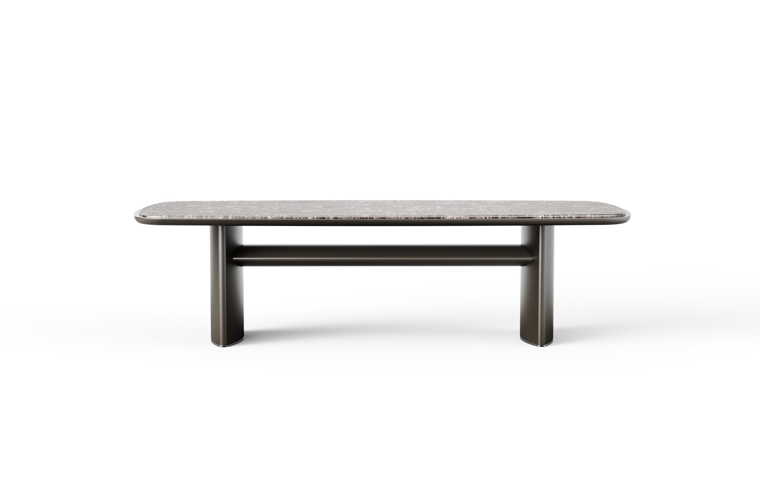 Pallien Dining Table is defined by the elegant interplay of oval forms, offering a versatile silhouette that adapts effortlessly to a range of dining settings. The soft-edged rectangular marble top showcases a polished surface that exudes quiet luxury, while its rounded profile enhances the table’s fluid character.