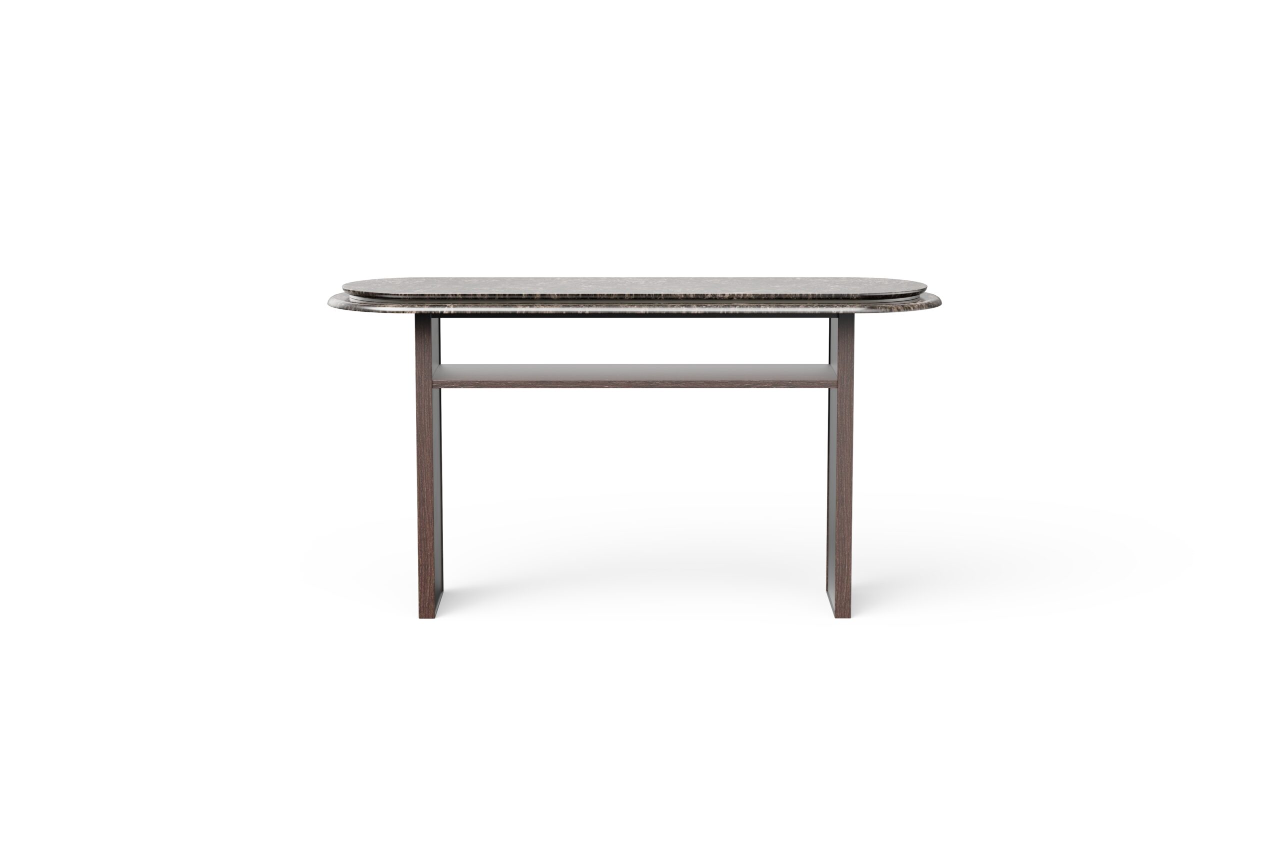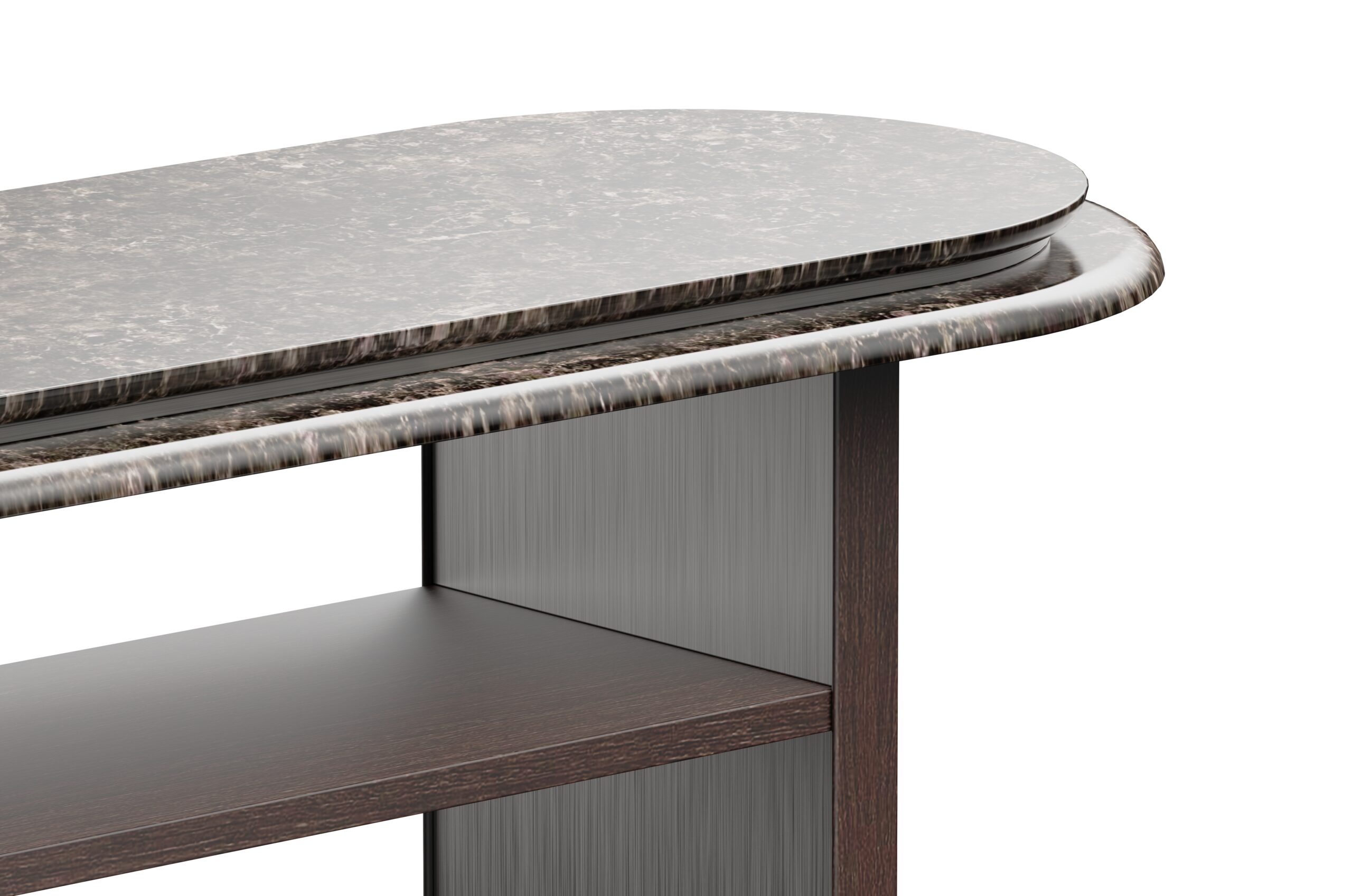 Its curvilinear top, crafted from beautifully layered stone, is highlighted by a sleek metal inlay that adds a refined gleam and accentuates its fluid form.The legs present a striking interplay of materials – veneer-finished exteriors, metallic interiors, and finely crafted wooden molding along the edges – creating depth and contrast. A veneered shelf below enhances usability while unifying the overall design.
