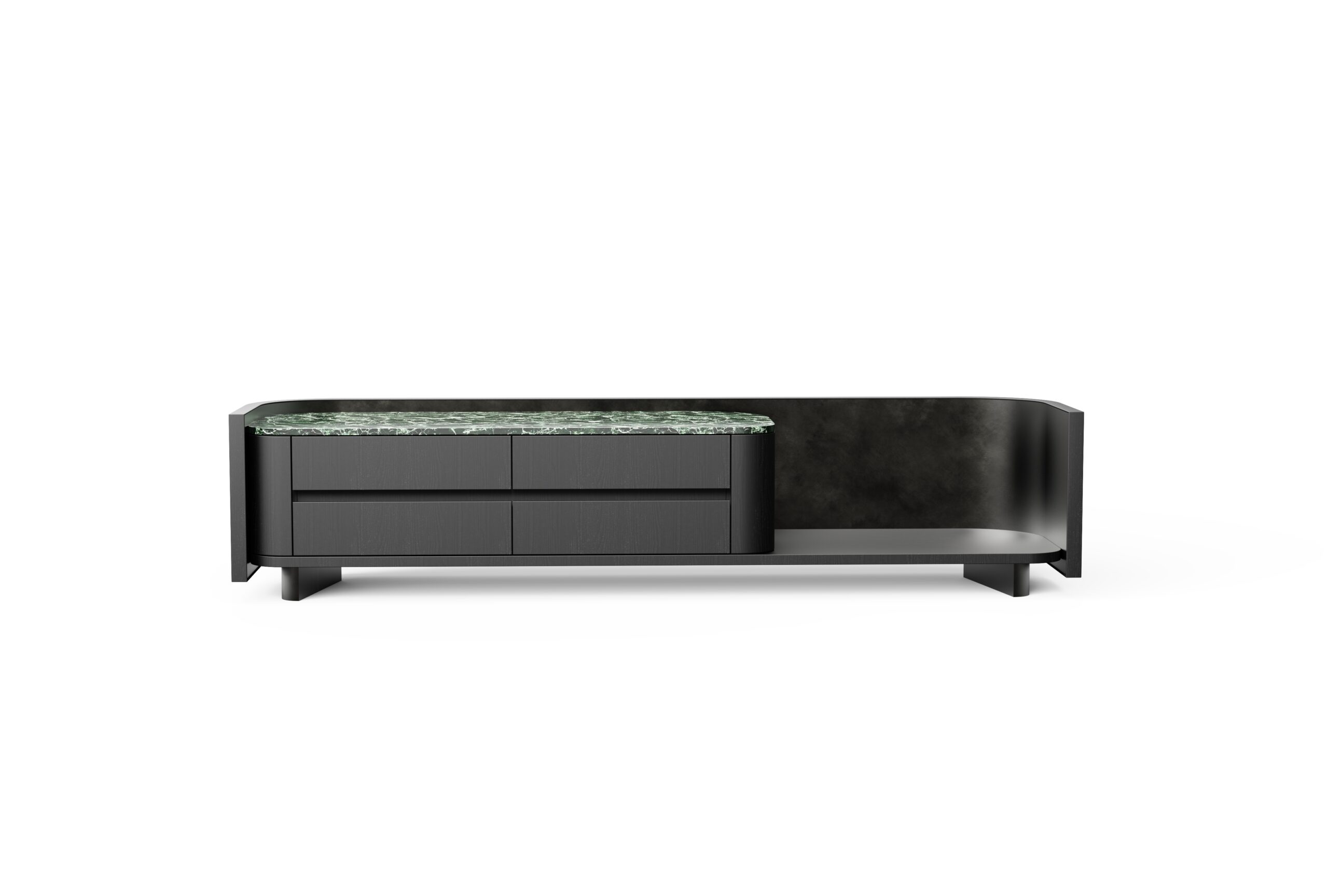 The exterior features rich veneer framed in solid wood molding, while the inner surfaces contrast beautifully in lustrous lacquered metal.Veneer-finished drawers with rounded corners blend seamlessly into the form, enhanced by discreet finger grooves for a clean, functional aesthetic. A polished stone top adds a refined sense of luxury.An asymmetrical open storage compartment provides visual interest and space for display, while sculpted lacquered metal legs give the piece a striking floating effect.
