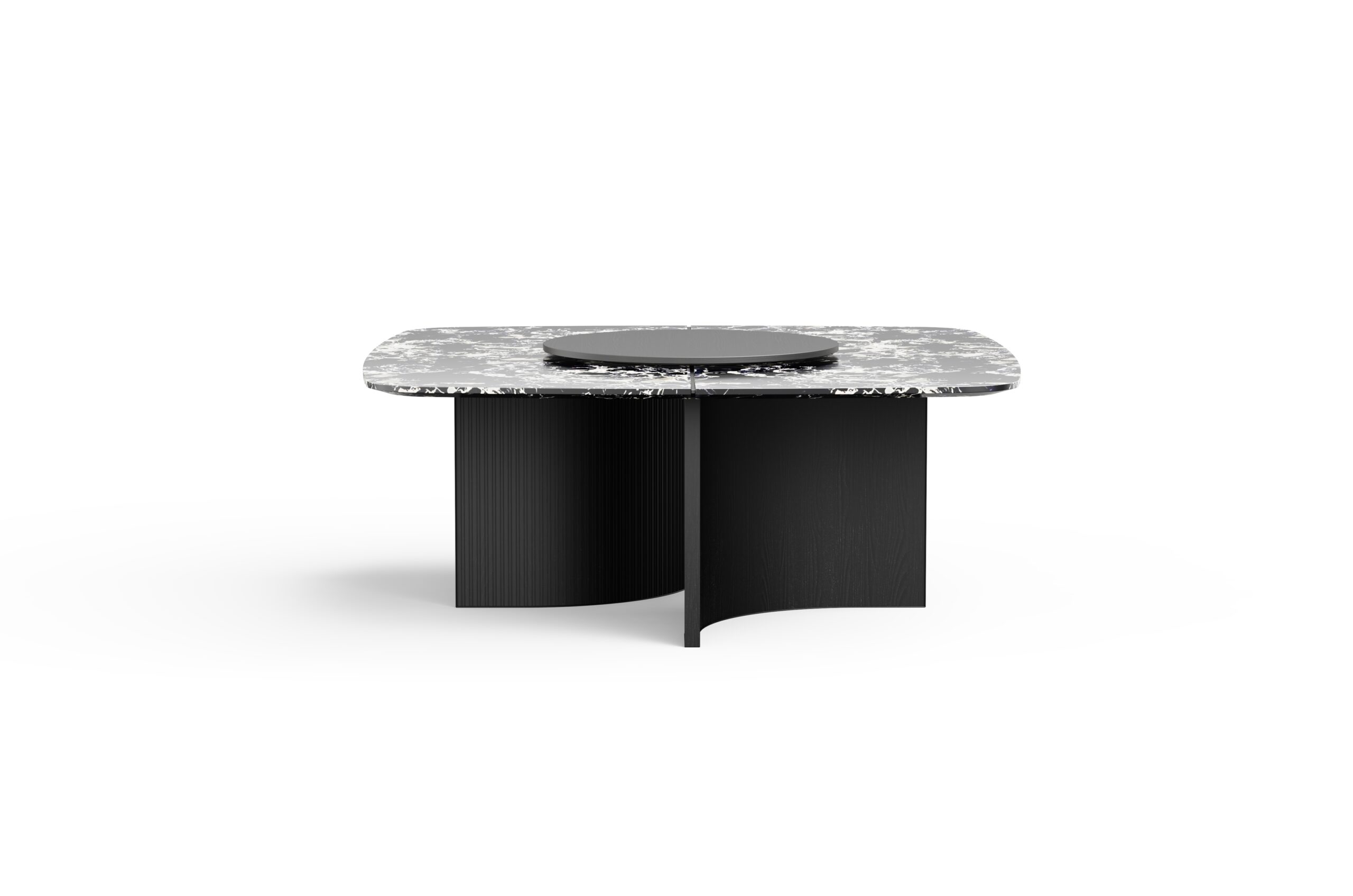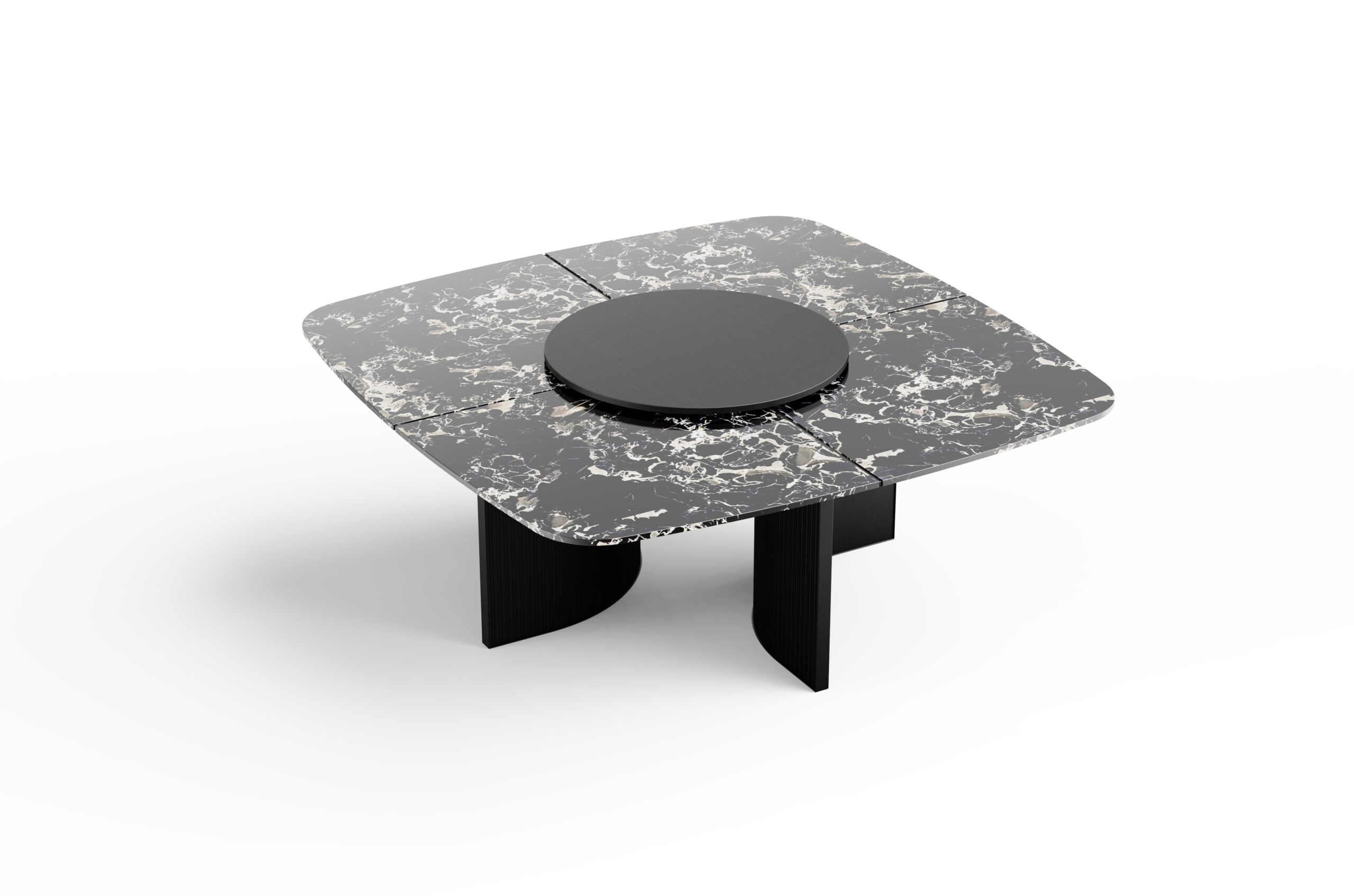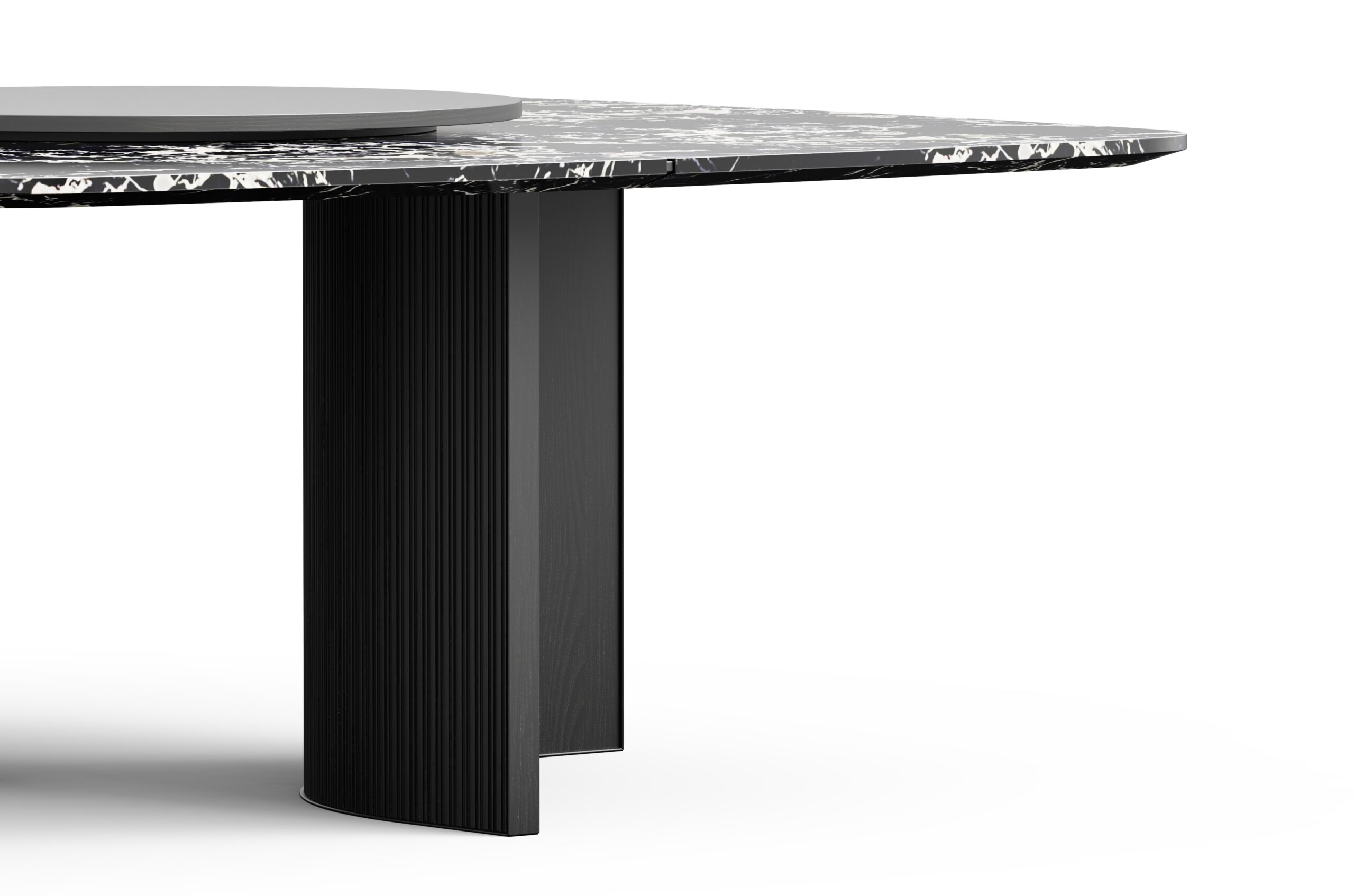 The Renza dining table combines modern elegance with enduring functionality. Its expansive square marble top, detailed with sleek metal inlays, is available with or without an integrated Lazy Susan for added versatility. Quadrant arc-shaped legs come in plain veneer exteriors with fluted wood interiors—framed by stained wood edges. With its layered materials and refined geometry, Renza elevates any dining space as a striking and practical centerpiece.
