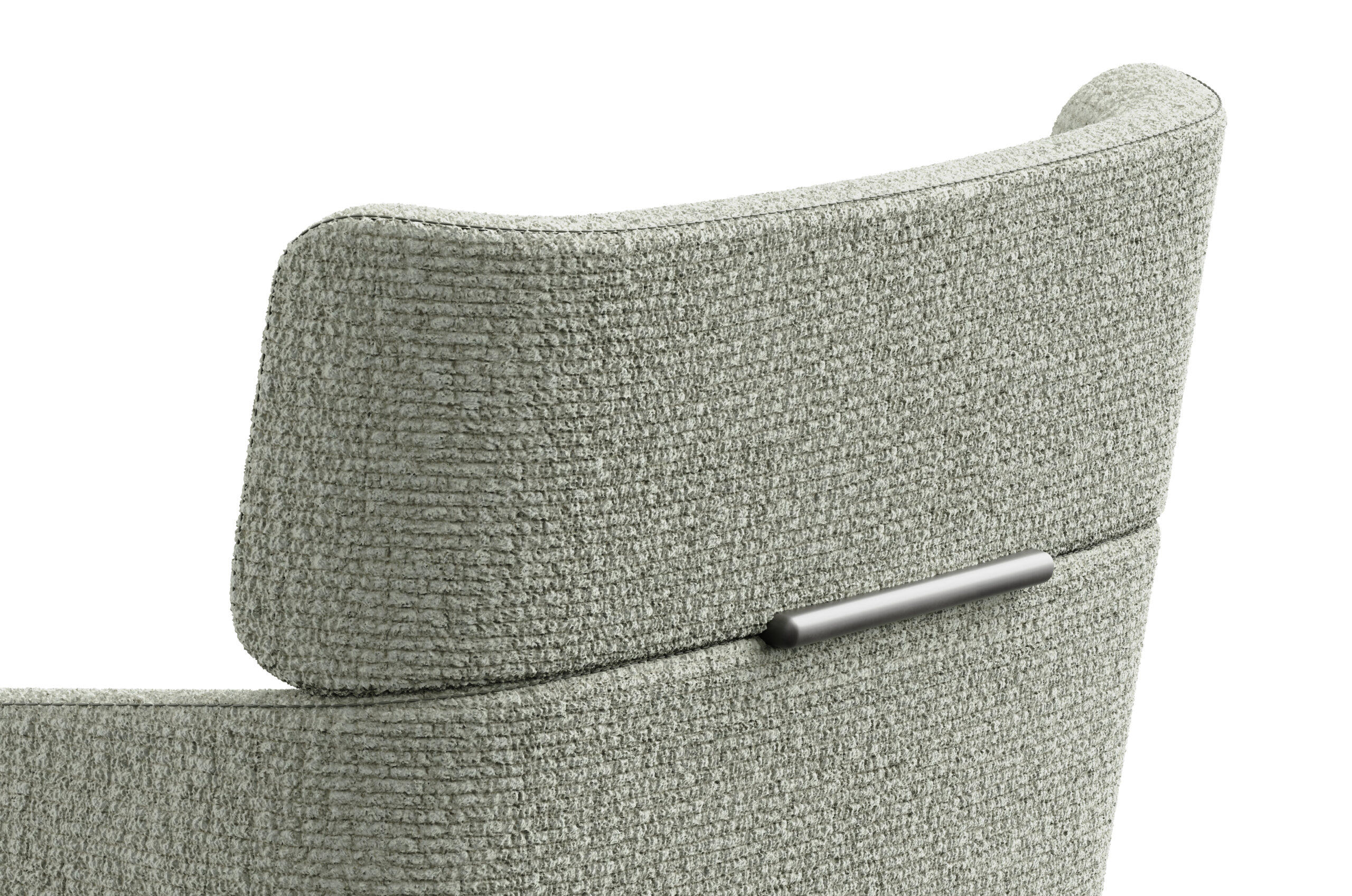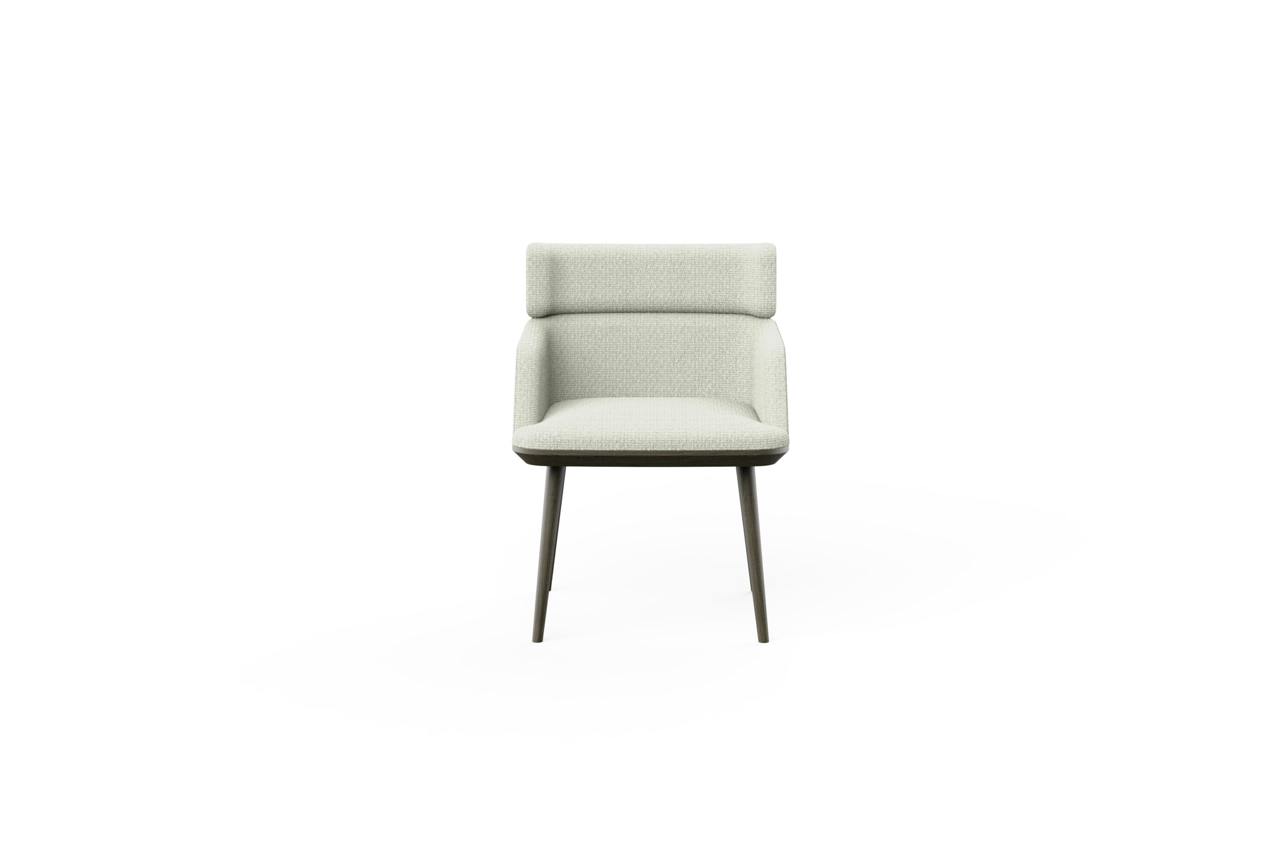 The armrests flow seamlessly into a gently curved backrest, subtly angled inward to evoke a warm, embracing feel. A finished metal pin at the rear junction of the armrest and backrest draws attention to the chair’s precise craftsmanship and seamless construction. The upholstered seat bucket rests gracefully on a chamfered wooden base, supported by tapered, turned wooden legs that lend a classic yet contemporary touch.