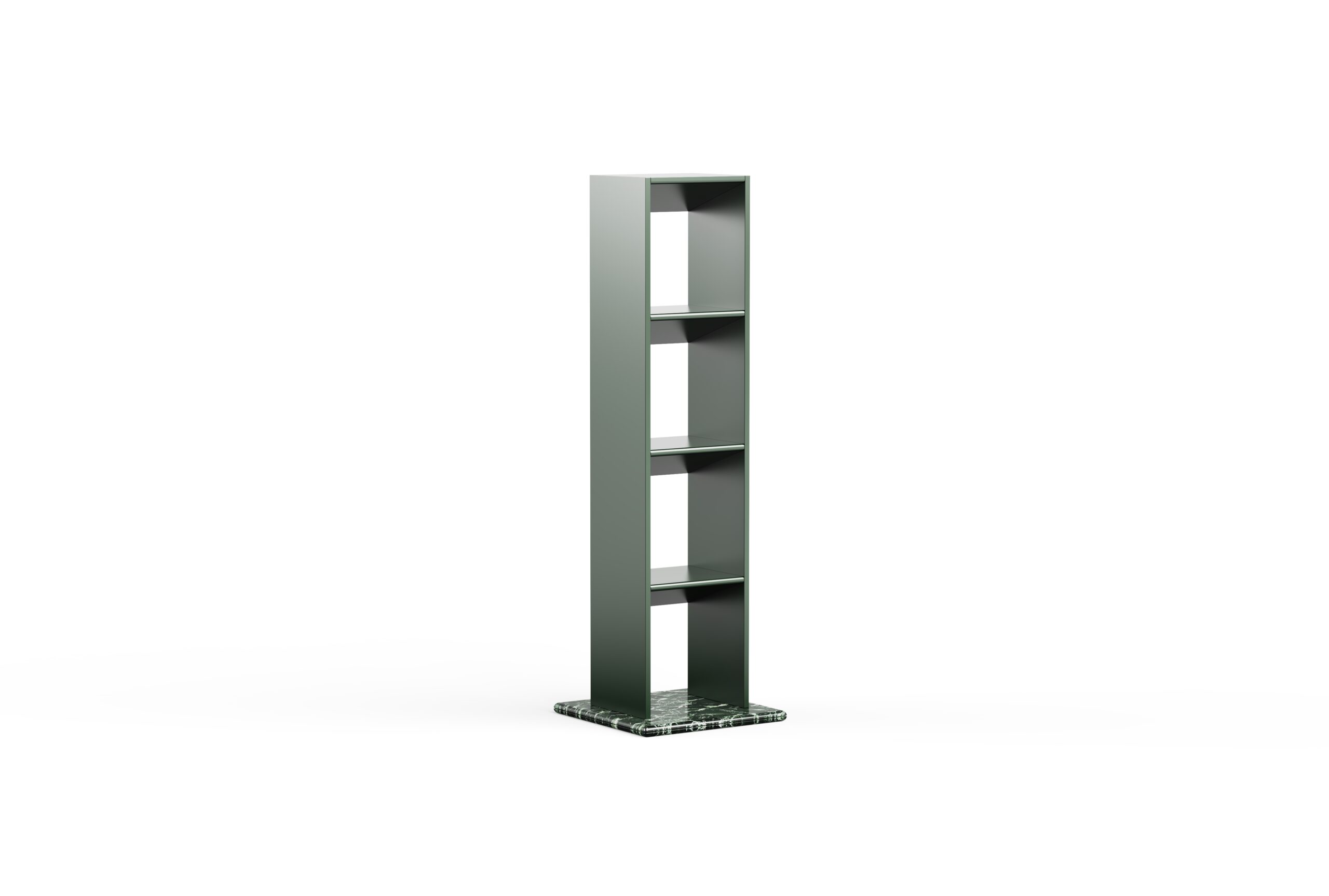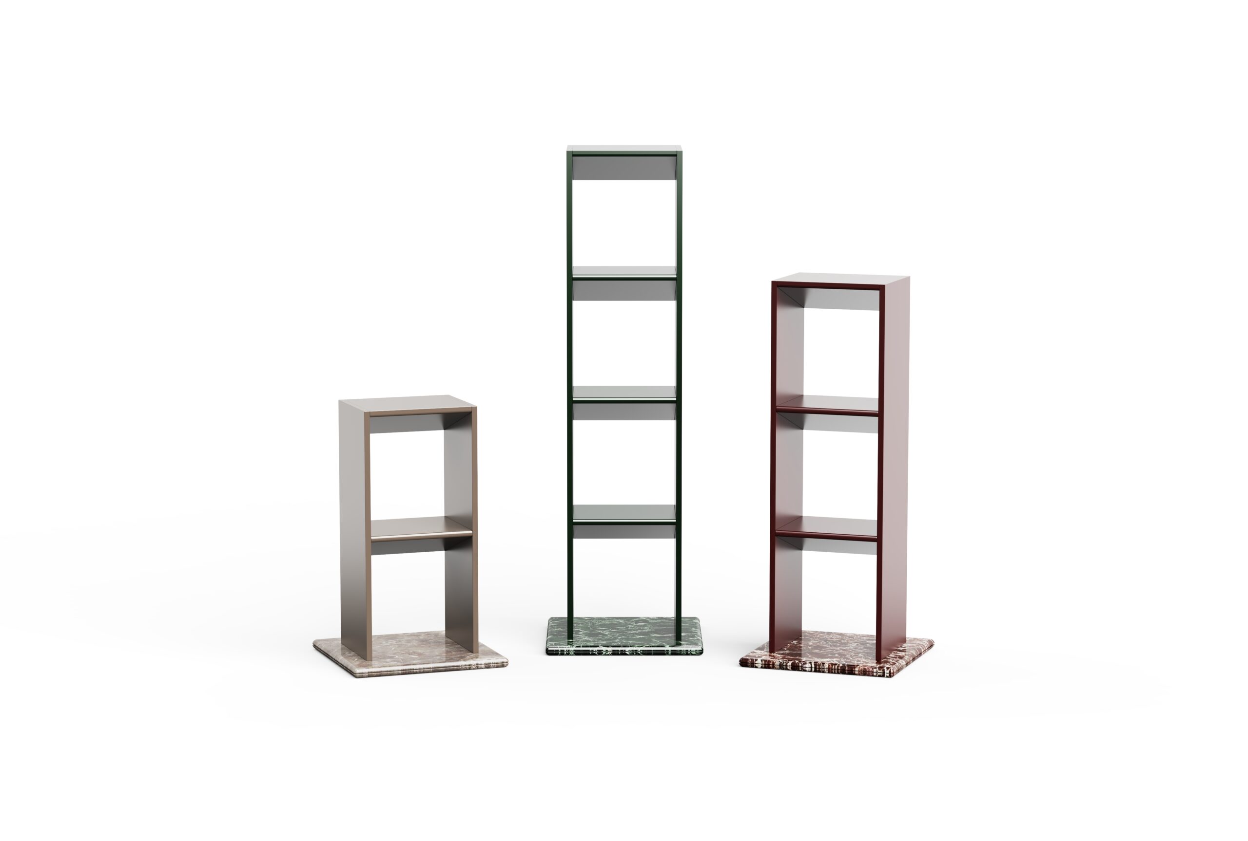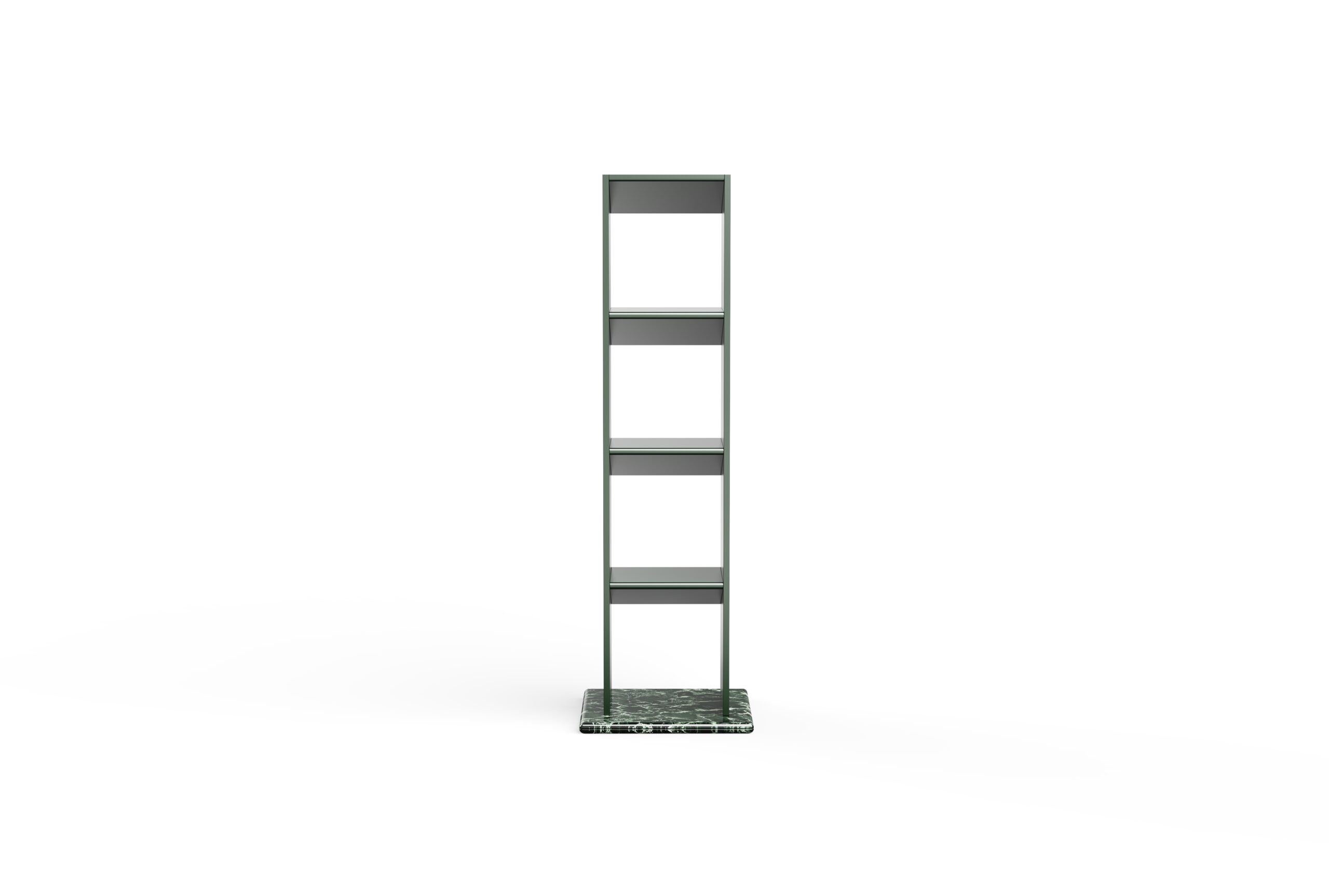 Tectra Shelving Unit balances architectural clarity with expressive materiality, offering a sophisticated blend of display and storage. Its clean rectilinear lacquered frame rests on a rich stone base, marrying the sleek simplicity of lacquer with the organic dynamism of natural stone. Each shelf features a slanted underside, introducing an element of intrigue that partially provides backdrop for objects, inviting curiosity.