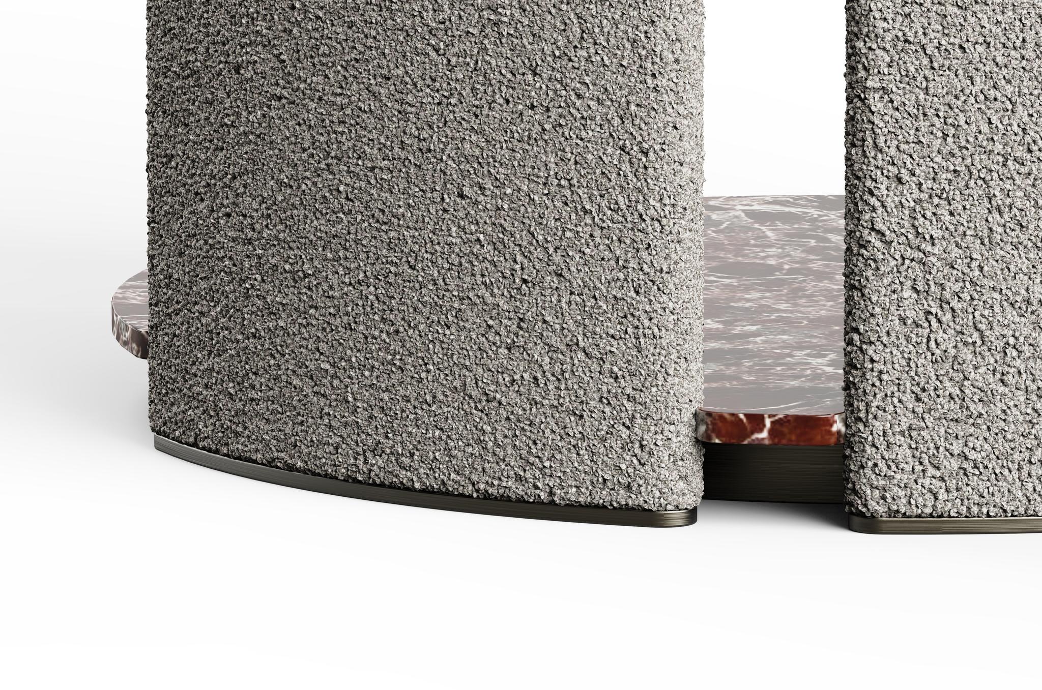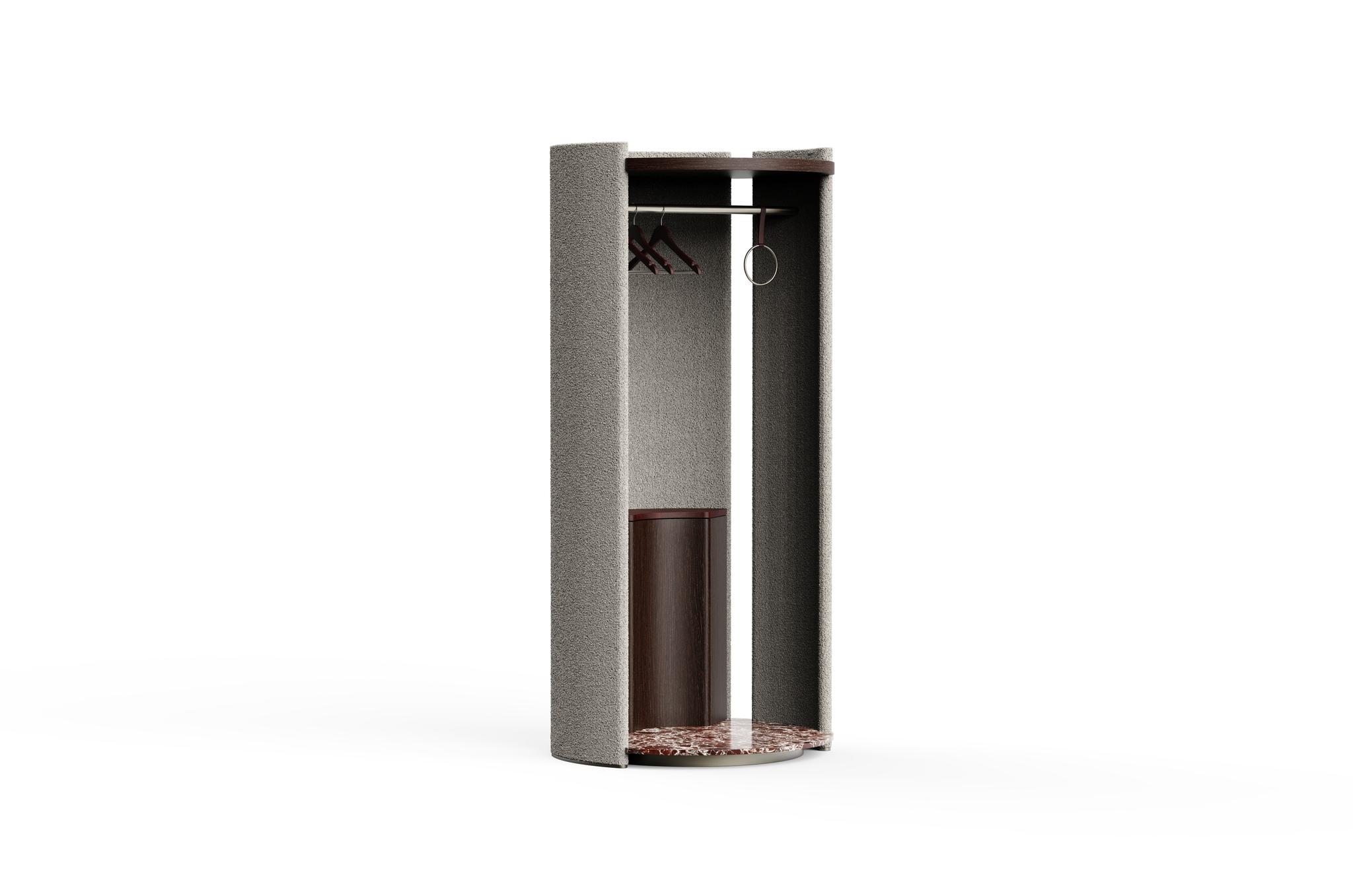 The Triess Valet Stand merges sophistication with daily function. Curved upholstered panels frame a rich veneer and smooth leather top—perfect for storing essentials. A veneer-finished unit with push-to-open shutters provides hidden storage, while a brushed metal hanger accommodates garments. Subtle LED backlighting enhances visibility and ambiance. Anchored by a polished stone base and sleek metal skirting, Triess brings refined elegance to everyday routines.