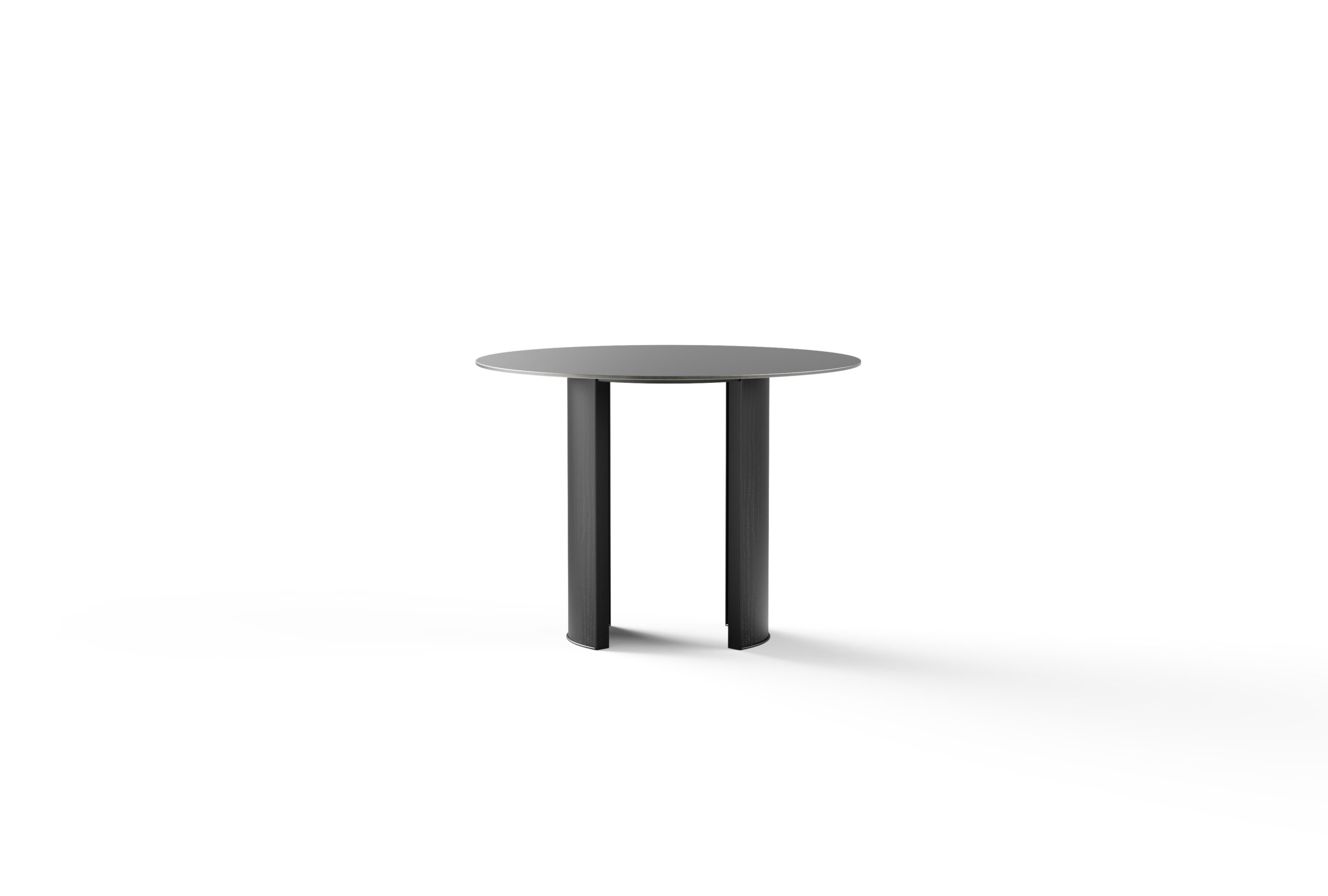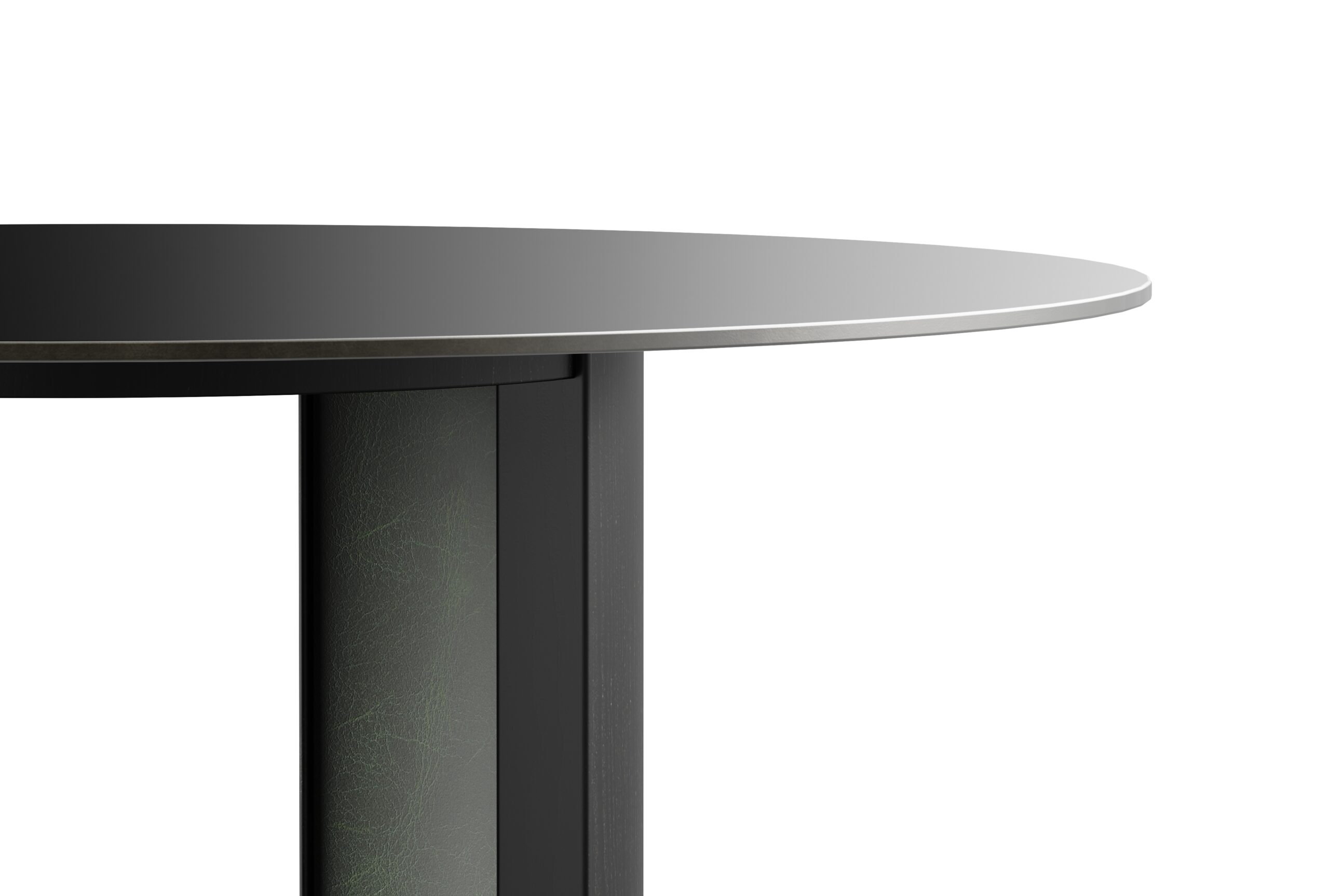 A sleek, cloudy finish metal top rests atop a veneer-finished base, creating a striking yet balanced contrast. The table’s distinctive legs feature a graceful convex arc profile that brings a sense of sculptural closure to the design.Outer leg surfaces are finished in veneer, while the inner faces are wrapped in premium leather – beautifully framed by solid wood molding along the sides and bottom.