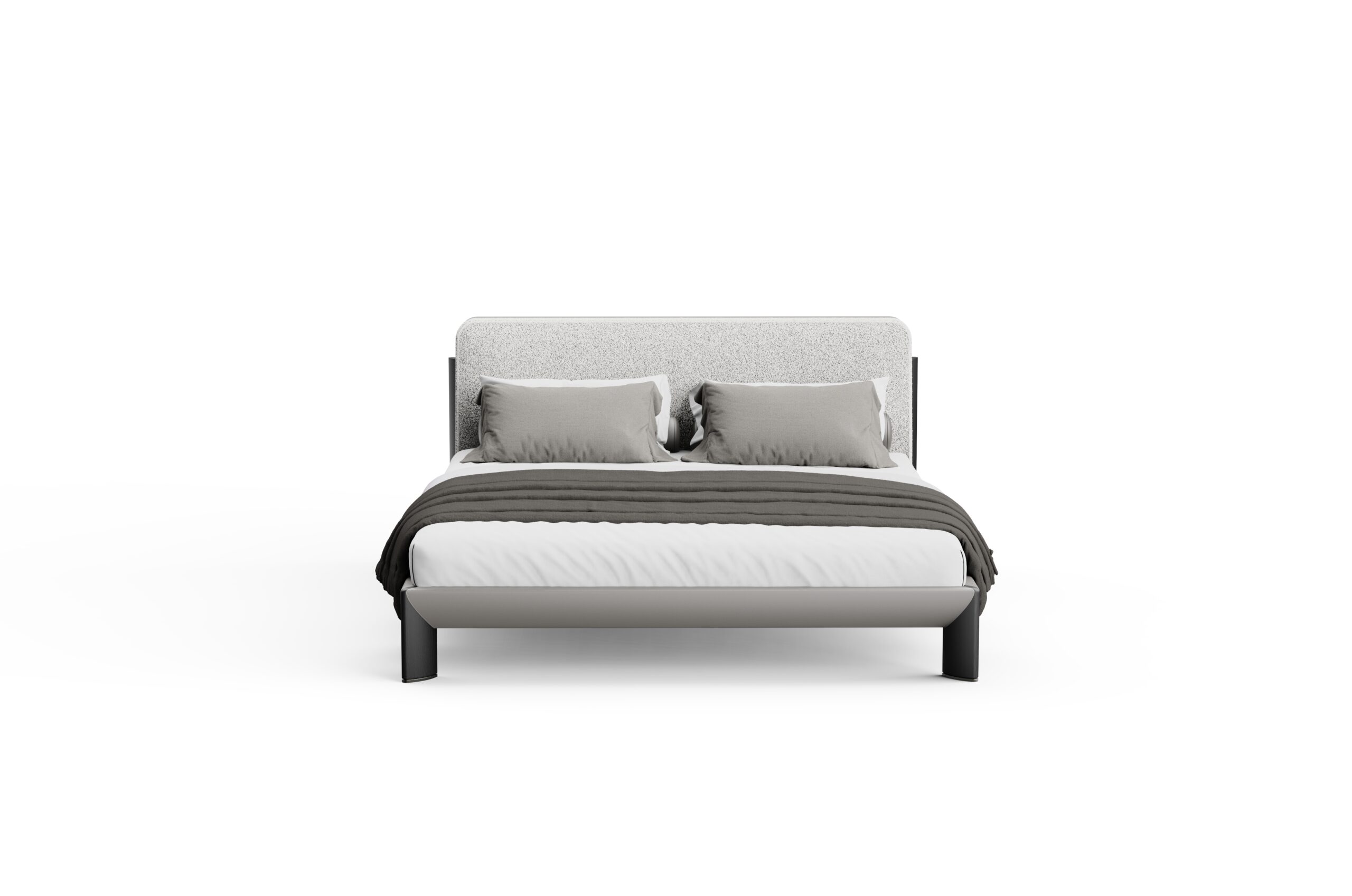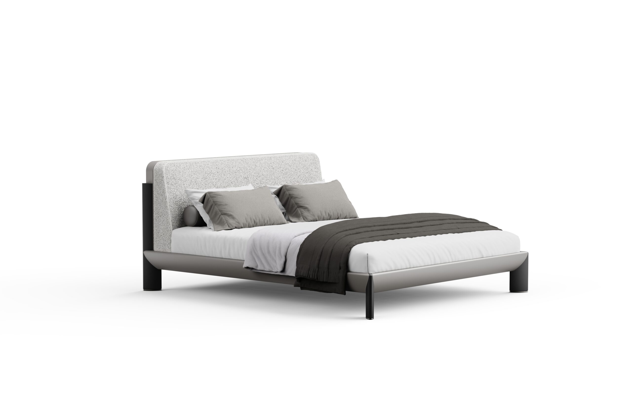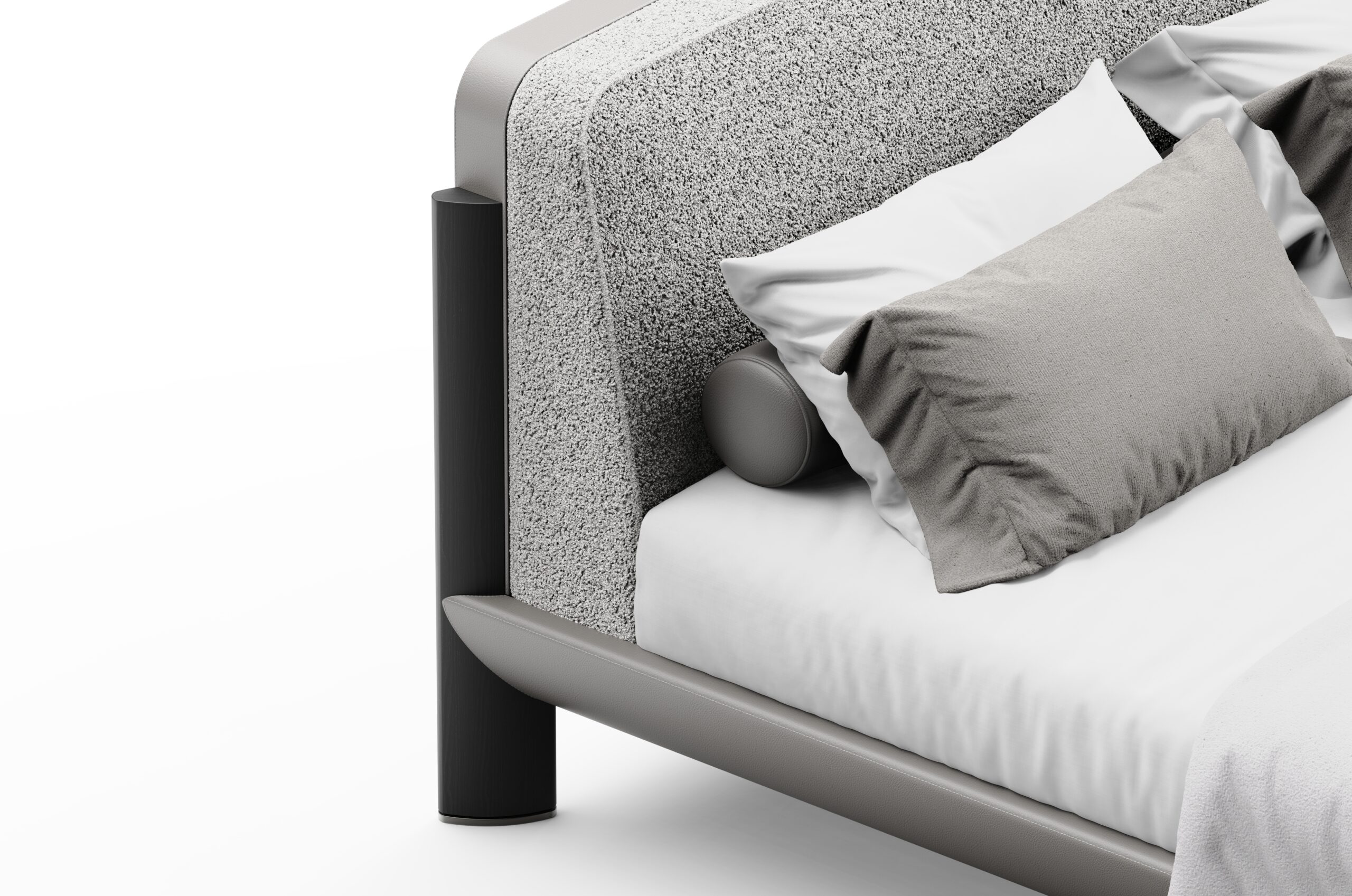 The rear legs rise fluidly to support a distinctive two-part headboard. The back panel, wrapped in leather with softly rounded corners, echoes the base’s curvature, while the front panel presents an angular, upholstered form that offers ergonomic support and visual contrast. Thoughtfully composed, Zeva blends structural precision with inviting softness – resulting in a bed that is both architecturally striking and inherently comfortable.